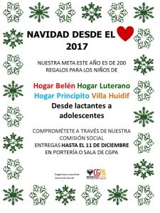 Como ya hace unos años, la Comisión Social del CGPA invita a todos los integrantes de nuestra Comunidad Educativa a enviar un pedacito de su corazón en forma de un regalo a niños de los hogares de menores que se han apoyado a través de diversas acciones de la comisión durante este año.