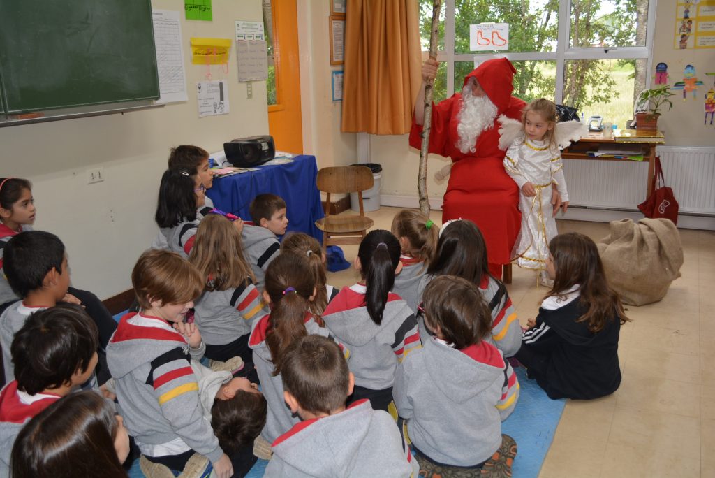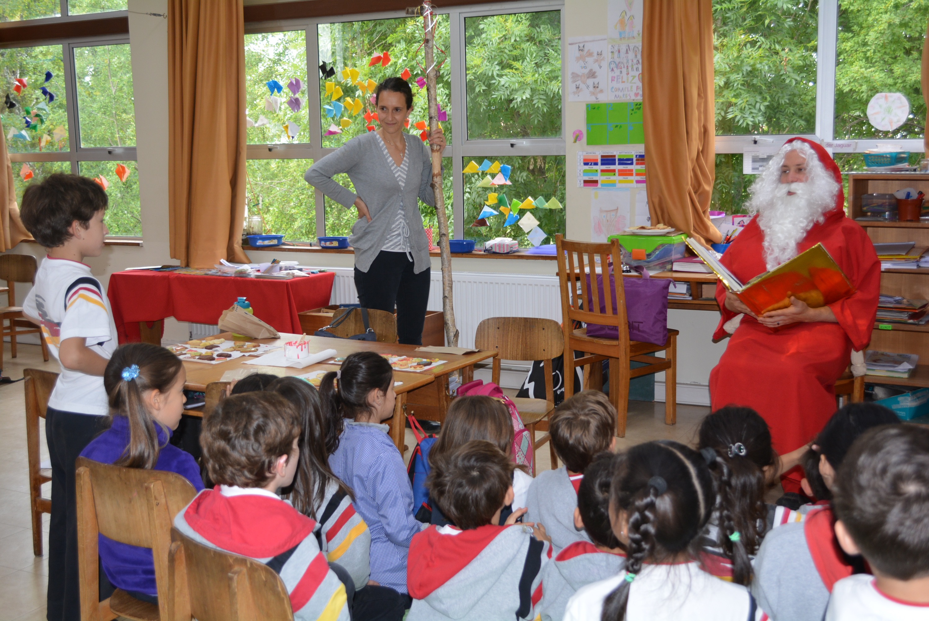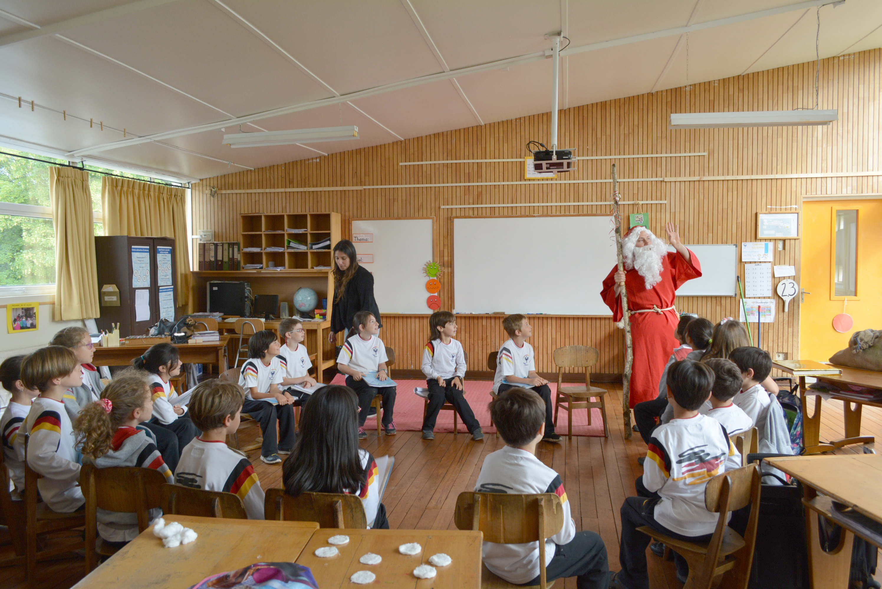 In seinem klassischen Gewand und von einem Engel begleitet klopfte der Nikolaus während der ersten Stunde an die Türen der Grundschulklassen. Zunächst trug er das Theodor Storm Gedicht „Knecht Ruprecht“ vor. Aus einem goldenen Buch, in dem die Namen aller Kinder der Welt stehen, las er den Schülern, die besonderes brav und fleißig waren, persönliche Botschaften vor. Schließlich erhielten die Grundschüler ihre gefüllten Stiefel und verabschiedeten den Gast mit Nikolaus-Liedern.