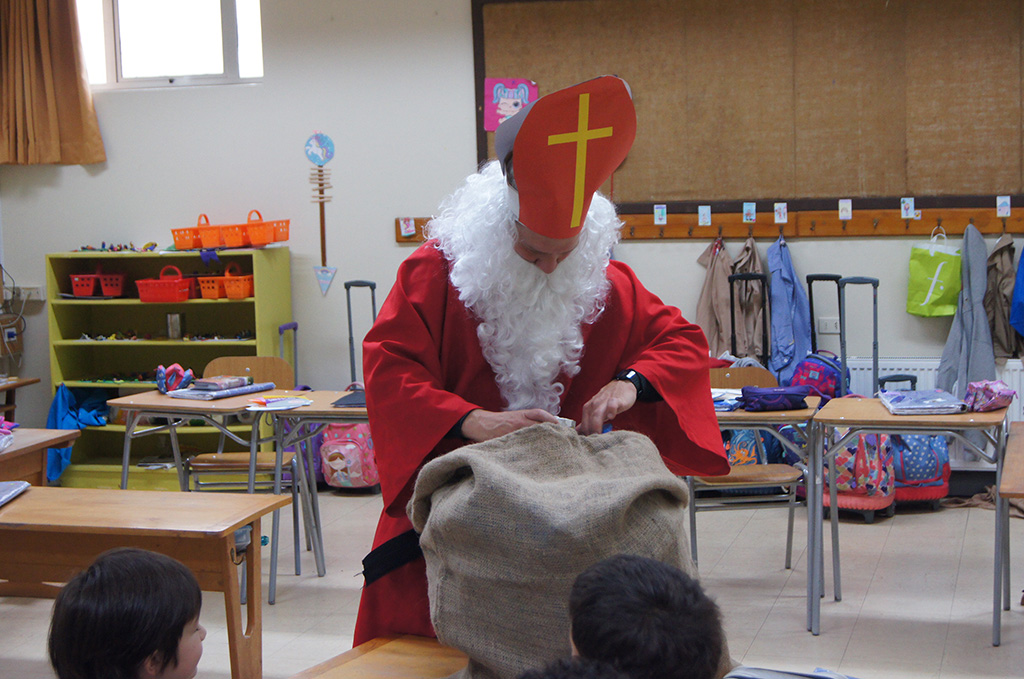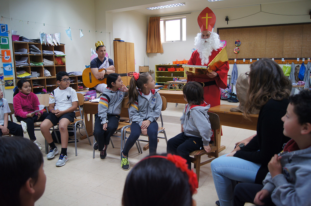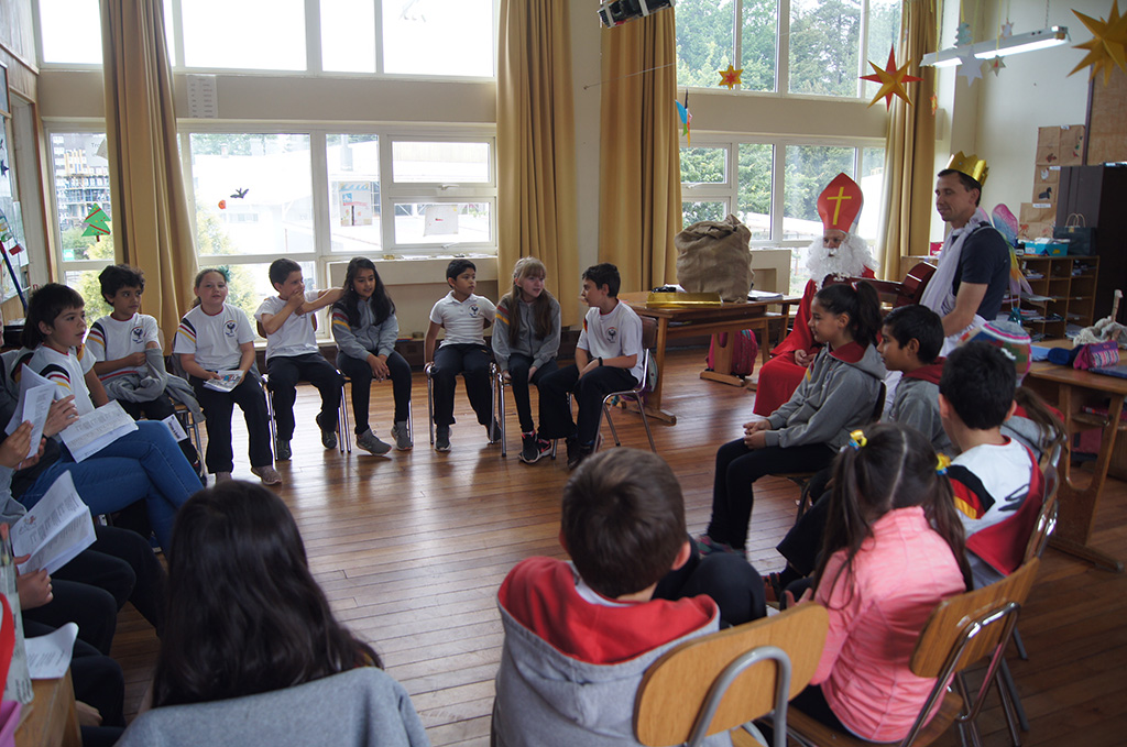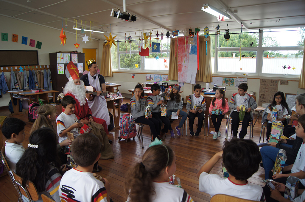 El querido Nikolaus y su ángel ayudante visitaron esta mañana a los alumnos de Primer Ciclo Básico en sus salas. El ángel irrumpía primero a través de la puerta y anunciaba a Nikolaus con una canción acompañada en guitarra. Luego entraba Nikolaus con su libro dorado bajo el brazo y su saco con las botas que los niños hicieron de distintos materiales, en las que, como es la tradición, les dejó golosinas.