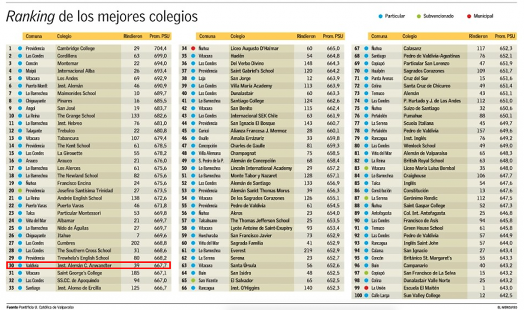 En el lugar 30 entre los primeros 100 colegios del país, según el ranking elaborado por la Universidad Católica de Valparaíso y publicado en el diario El Mercurio, quedó nuestro Instituto. La generación 2016 logró un promedio de 667,7 puntos en la Prueba de Selección Universitaria, un muy buen resultado, el mejor promedio PSU en la región, sólo seguido por la Escuela El Maitén de La Unión, que presentó un alumno con promedio de 643 puntos, que dejó a este establecimiento en el lugar 99 del ranking.