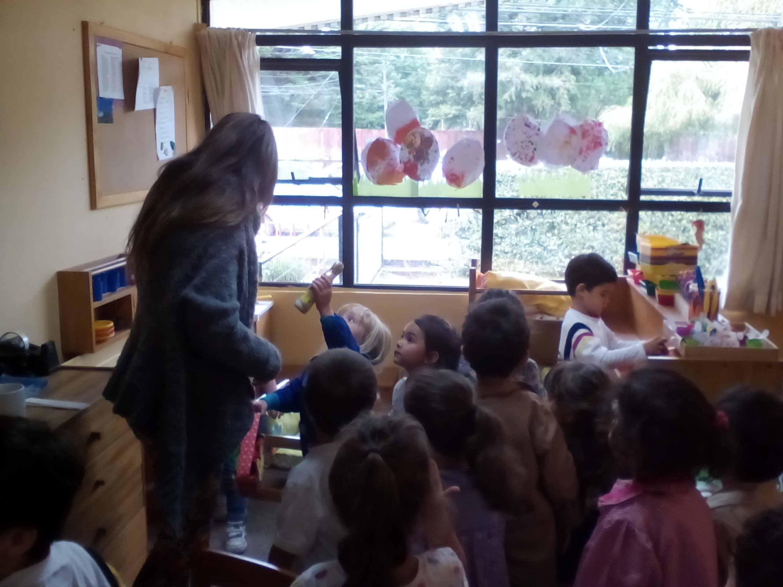 El lunes desayunaron en conjunto por niveles con pan y huevos duros, y recibieron la visita de los alumnos de IV medio, quienes les pintaron las caritas como conejos y cantaron con ellos varios temas.