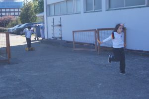 En la caseta se encuentran los encargados, dos alumnos de 5º y 6º básicos que se van turnando, según la programación que realizan sus profesores jefes, quienes entregan los elementos de entretención a los interesados. Durante estas primeras semanas, cada día se suman más alumnos y disfrutan de los elásticos, zancos compartidos, emboques, cuerdas, ula ula, brincadores, saltadores con bola, y otros más, para que se entretengan mientras se ejercitan. De 1º a 3º básico pueden ir durante el primer recreo; en el segundo recreo asisten de 4º a 6º.