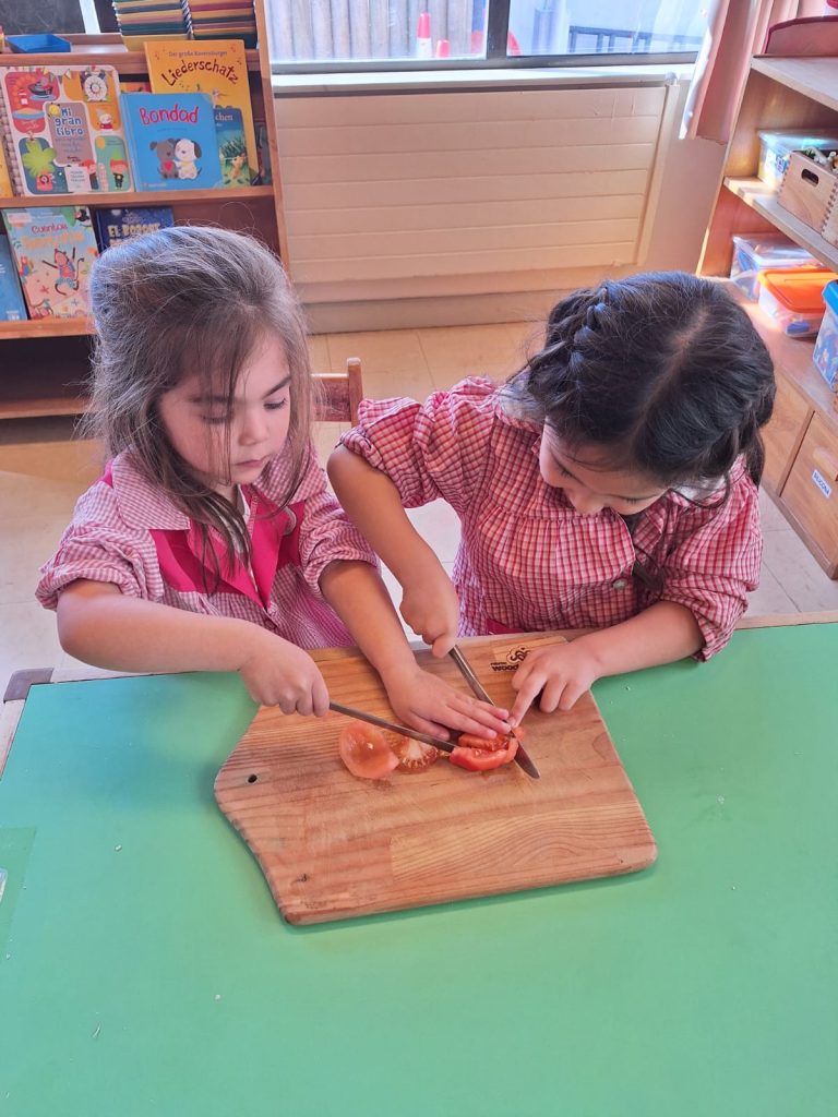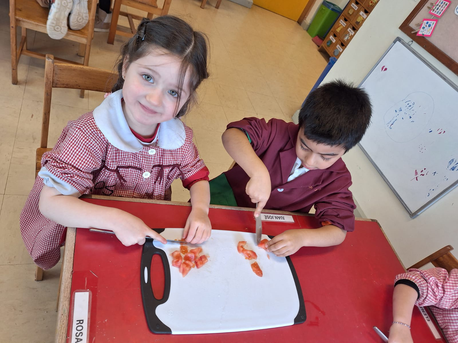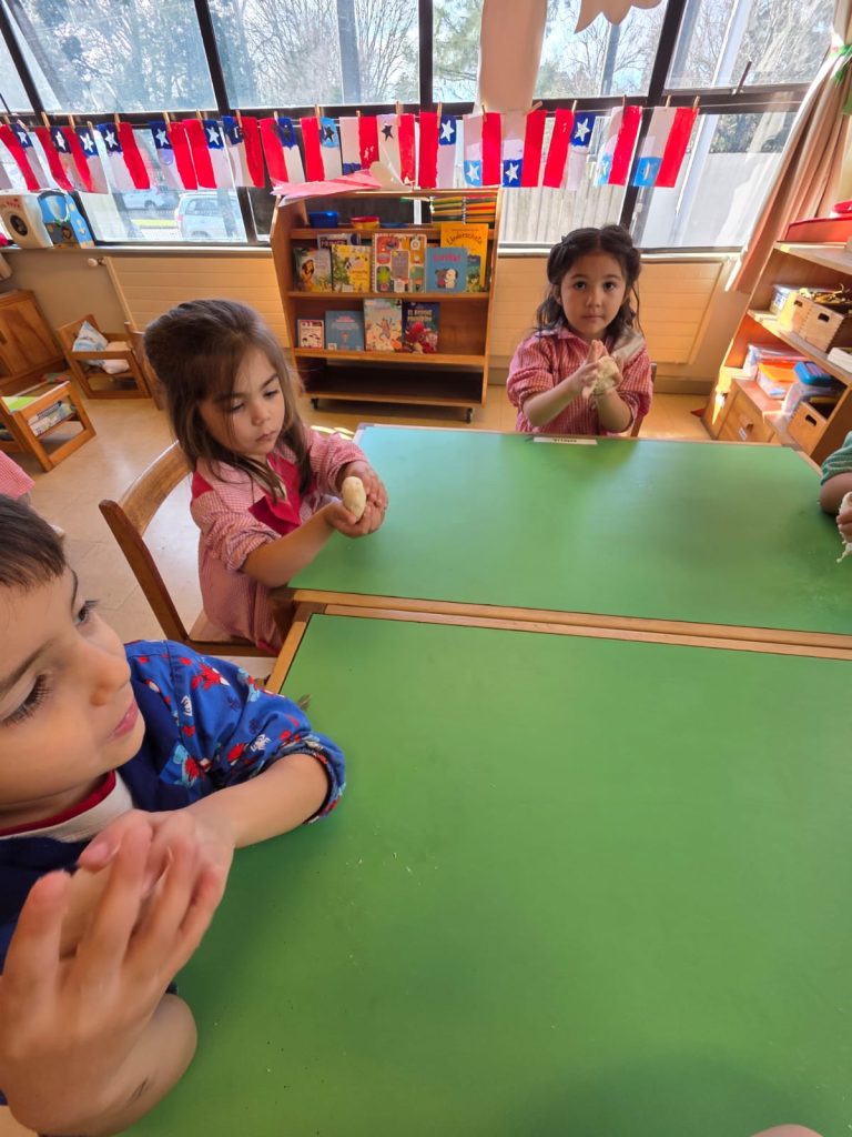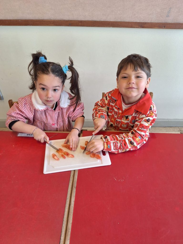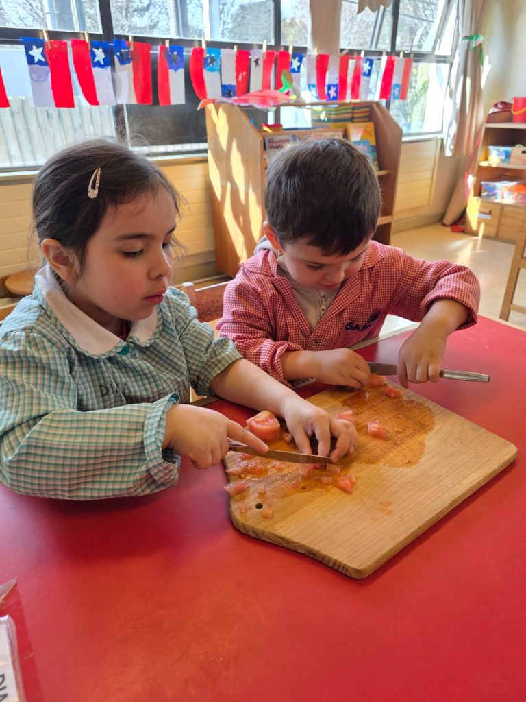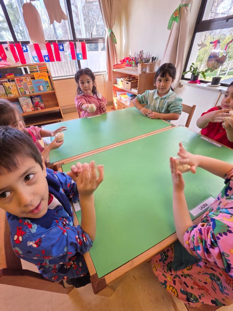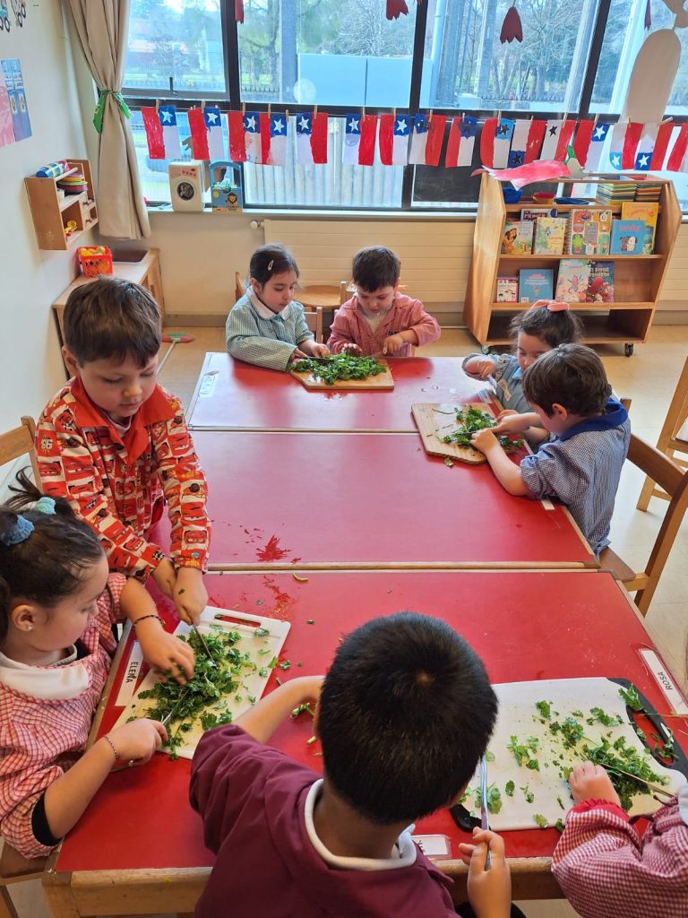 La jornada se desarrolló en dependencias del Preescolar, donde los estudiantes elaboraron pan amasado y pebre siguiendo las indicaciones de sus educadoras. La experiencia buscó acercarlos a tradiciones gastronómicas chilenas y fomentar el trabajo colaborativo.
