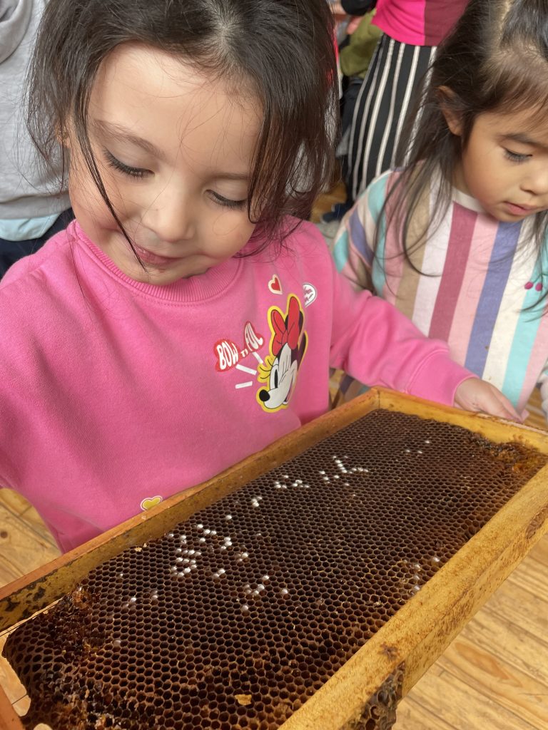 Durante la visita, los alumnos pudieron observar de cerca distintos elementos utilizados en la apicultura, como cajones, marcos y herramientas de trabajo, los cuales fueron presentados y explicados por las propias familias. La actividad permitió reflexionar, de forma lúdica y participativa, sobre el rol fundamental que cumplen las abejas en el equilibrio del ecosistema y la conservación de la biodiversidad.