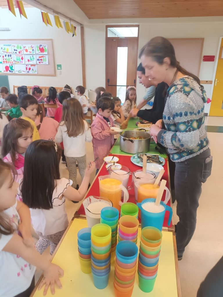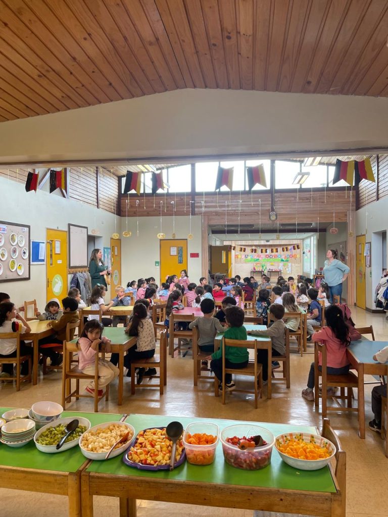El miércoles 08, en el hall de Prekínder, prepararon una colación saludable con ensaladas, frutas y jugos naturales a partir de los productos escogidos por ellos. Finalmente, compartieron la colación en comunidad, reforzando hábitos de autocuidado, colaboración y responsabilidad.