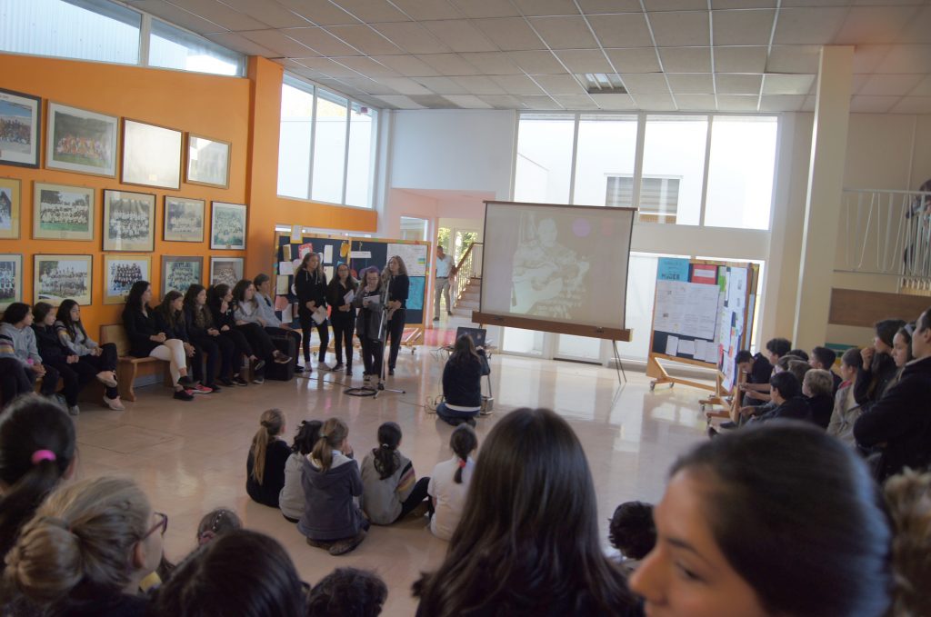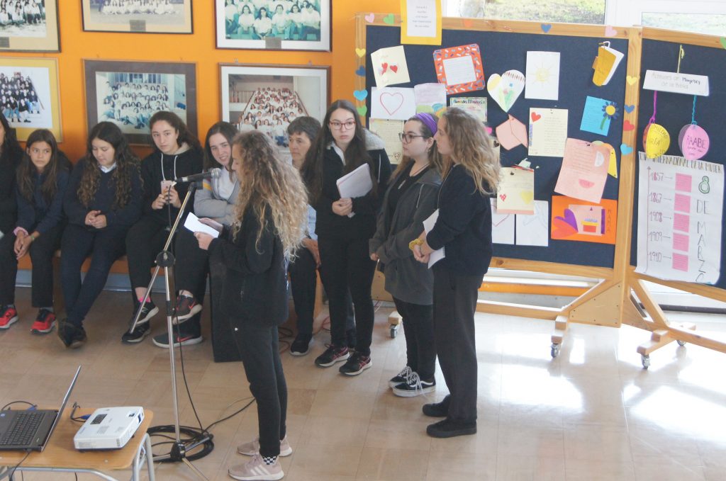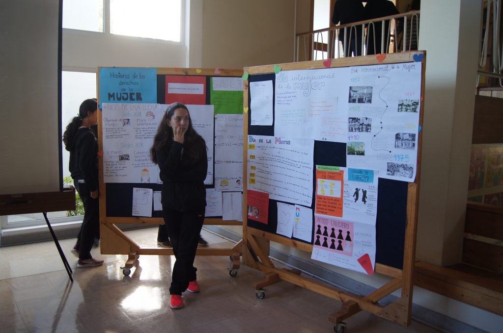 Durante el primer recreo se realizó un pequeño acto en conmemoración del Día Internacional de la Mujer, que programó el Departamento de Lenguaje y Comunicación. Alumnas de III medio recordaron la importancia de esta fecha y leyeron datos de algunas mujeres importantes en la historia, así como de aquellas que hace poco fueron nombradas para denominar algunas estaciones del Metro de Santiago, como reconocimiento a sus aportes.
