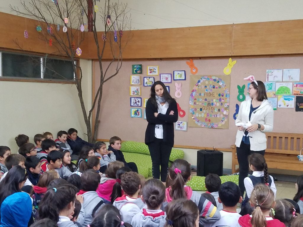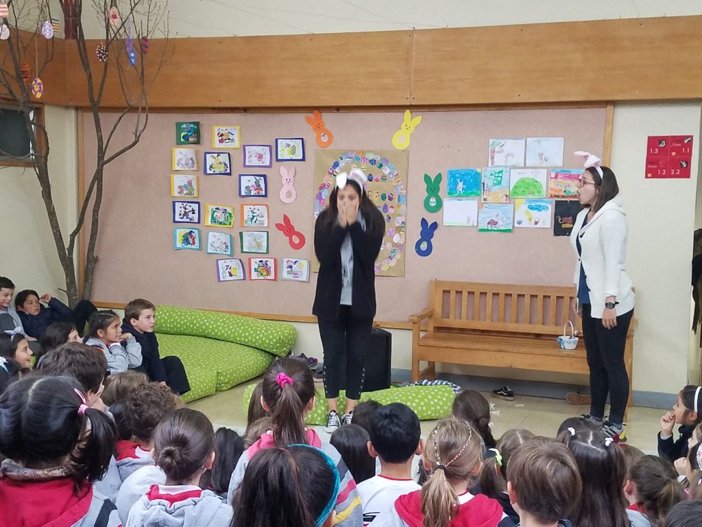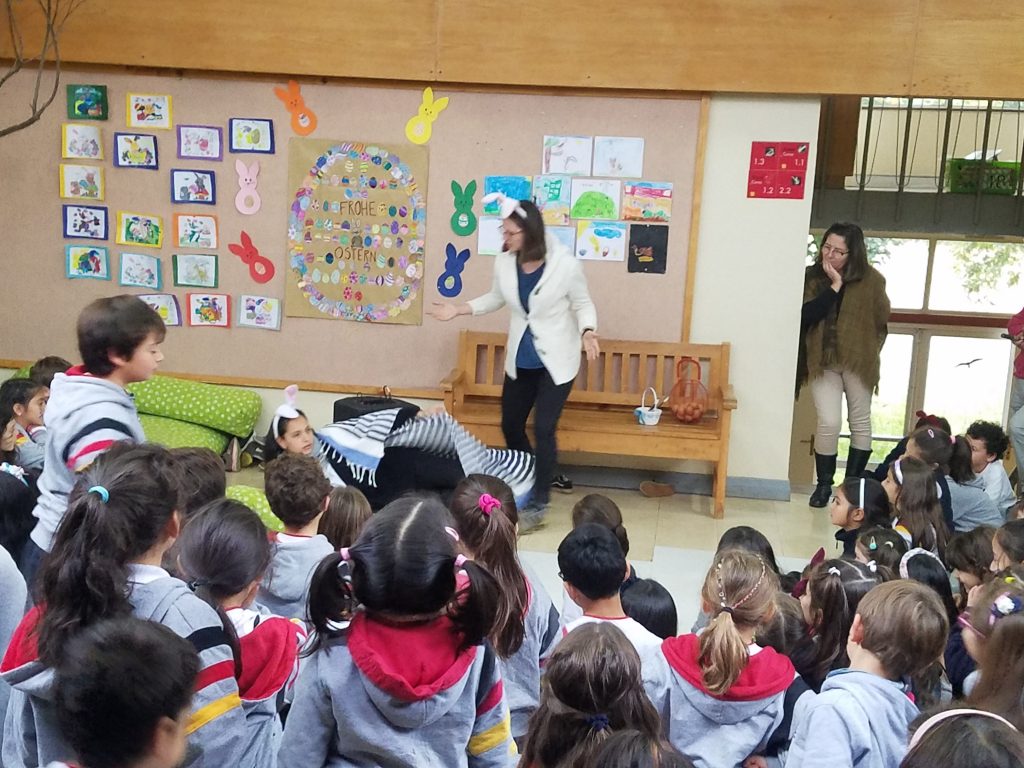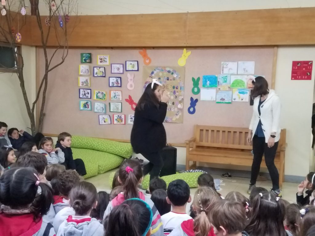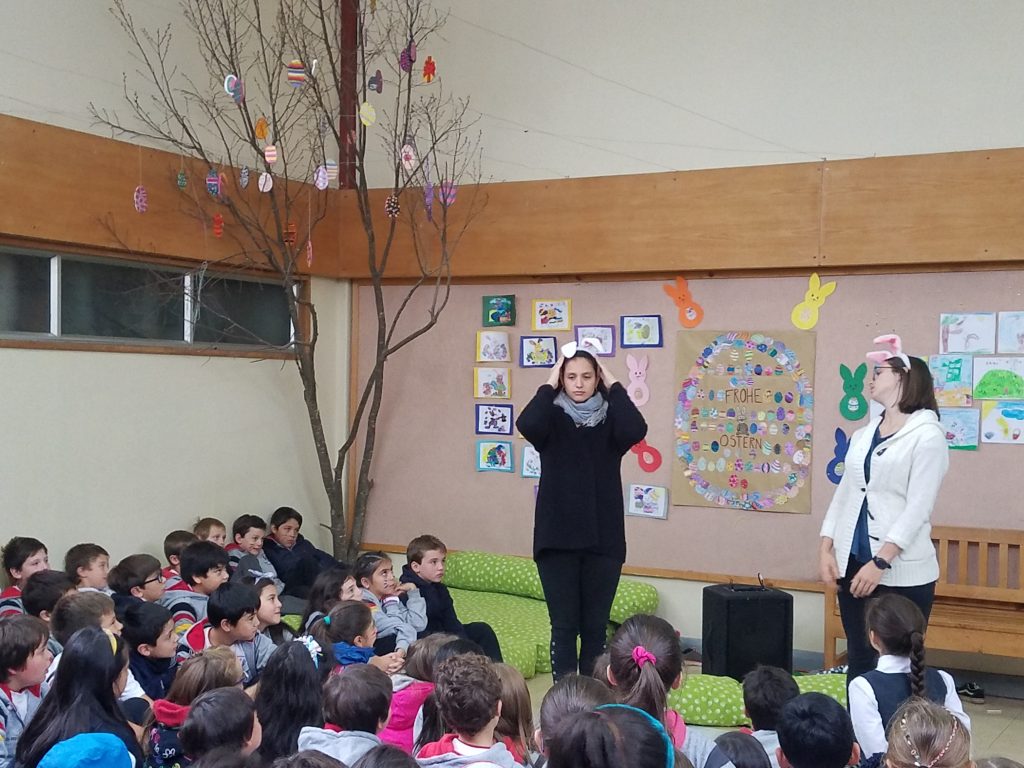 Las profesoras Martina Ziegele y Rahel Gysel realizaron esta mañana la dramatización de un pequeño cuento para los alumnos de Primer Ciclo Básico en el hall del nivel.