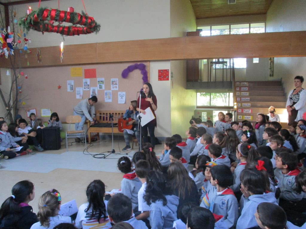 Todos los cursos de 1º a 4º básico se reunieron en el hall para entonar villancicos, dirigidos por la profesora Teresa Benavides. En esta oportunidad, fueron algunos temas relativos a Nikolaus, que ya se acerca, los que cantaron los niños.
