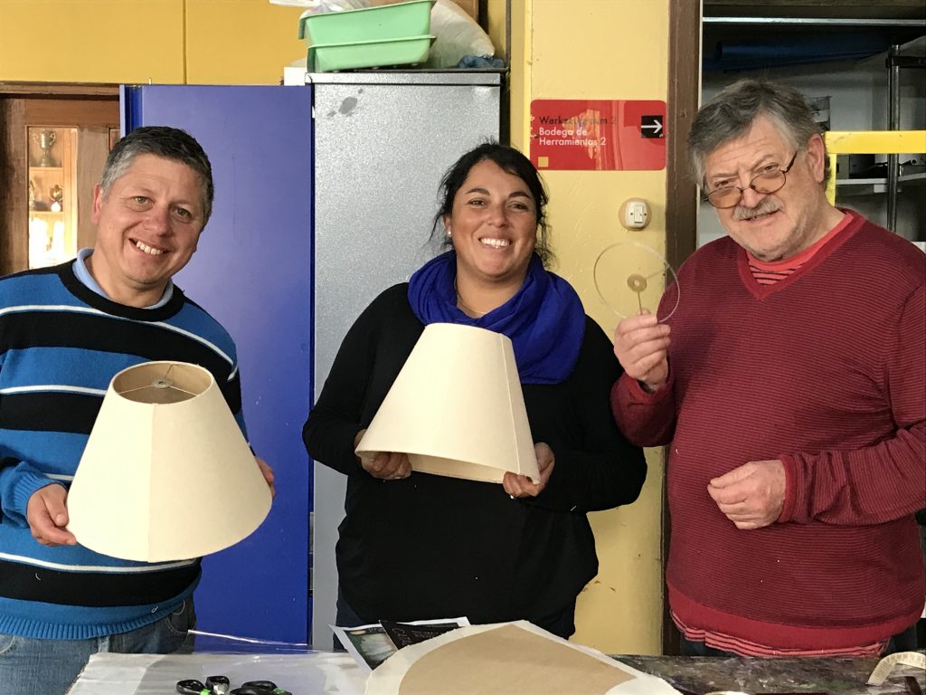 Los profesores Natalia Sepúlveda, Anita Schwarzenberg y Juan Araneda asistieron el lunes 04 al taller de Carlos Reyes, para capacitarse en la confección de pantallas para lámparas, especialmente pantallas cónicas.