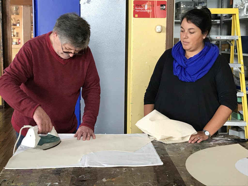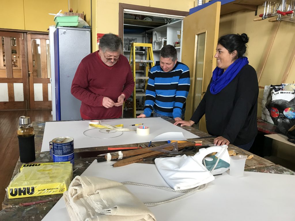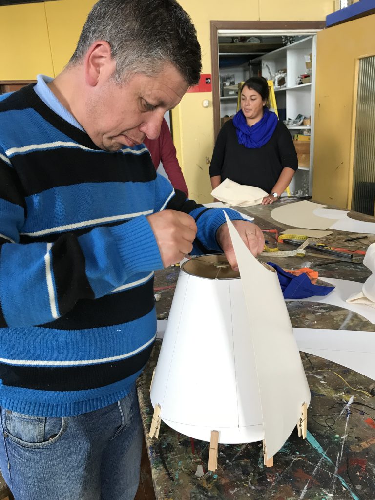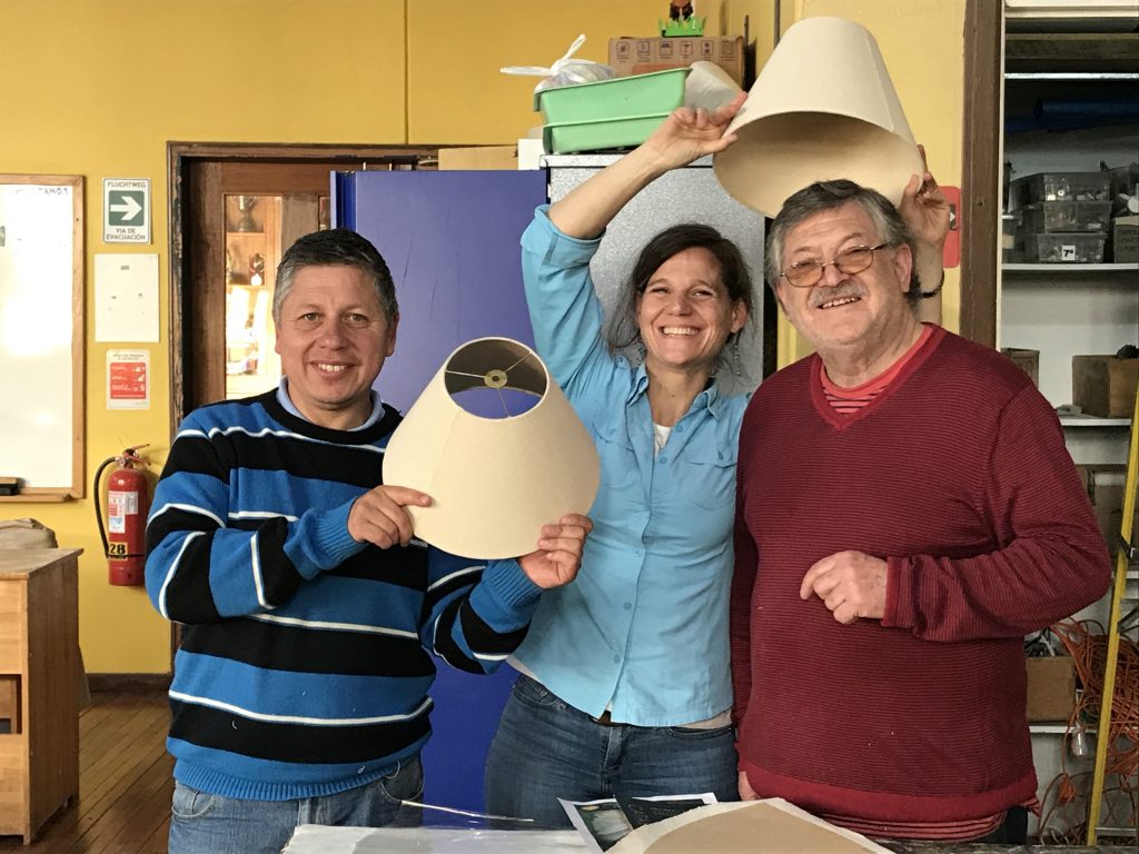 Los profesores Natalia Sepúlveda, Anita Schwarzenberg y Juan Araneda asistieron el lunes 04 al taller de Carlos Reyes, para capacitarse en la confección de pantallas para lámparas, especialmente pantallas cónicas.