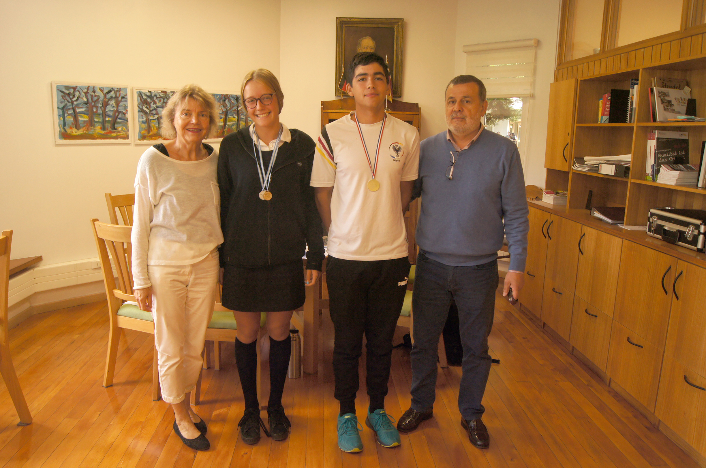 En el primer recreo de ayer nuestra Rectora Liske Salden recibió en su oficina a Magdalena Nannig y Oscar Arias para felicitarlos personalmente por sus logros deportivos en remo. Ambos alumnos han ganado recientemente competencias en sus respectivas categorías, que les han hecho merecedores no sólo de medallas, sino también de clasificación a campeonatos internacionales.
