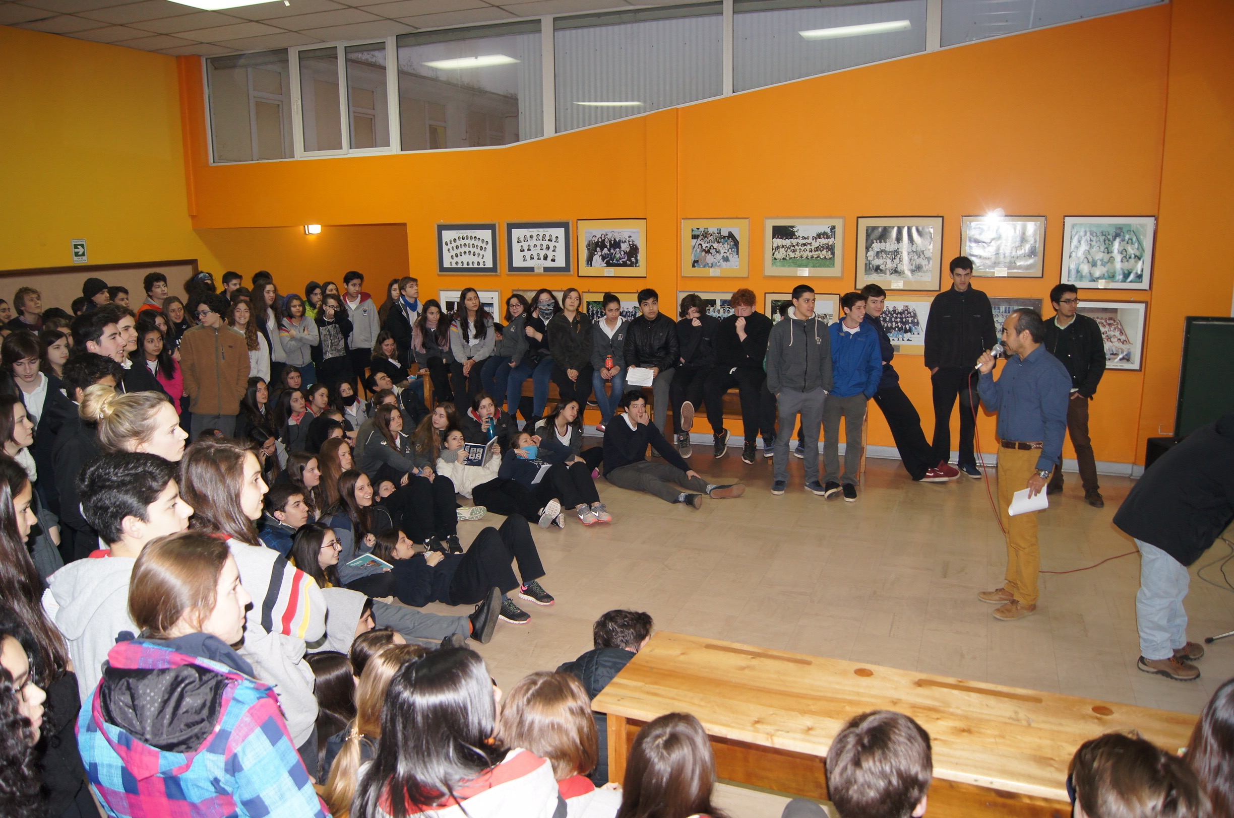 Róbinson Carvajal, Coordinador Técnico – Administrativo y encargado de Seguridad Escolar, expuso hoy por turnos a los alumnos de I a IV medio, y de 5º y 6º, y de 7º y 8º, las falencias observadas durante el último ejercicio de evacuación realizado el 03 de agosto, que simuló un traslado de emergencia a las zonas de seguridad en caso de terremoto.