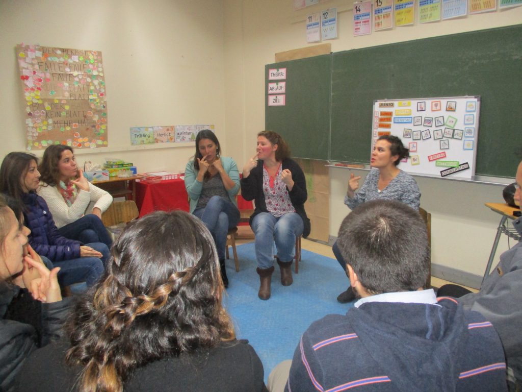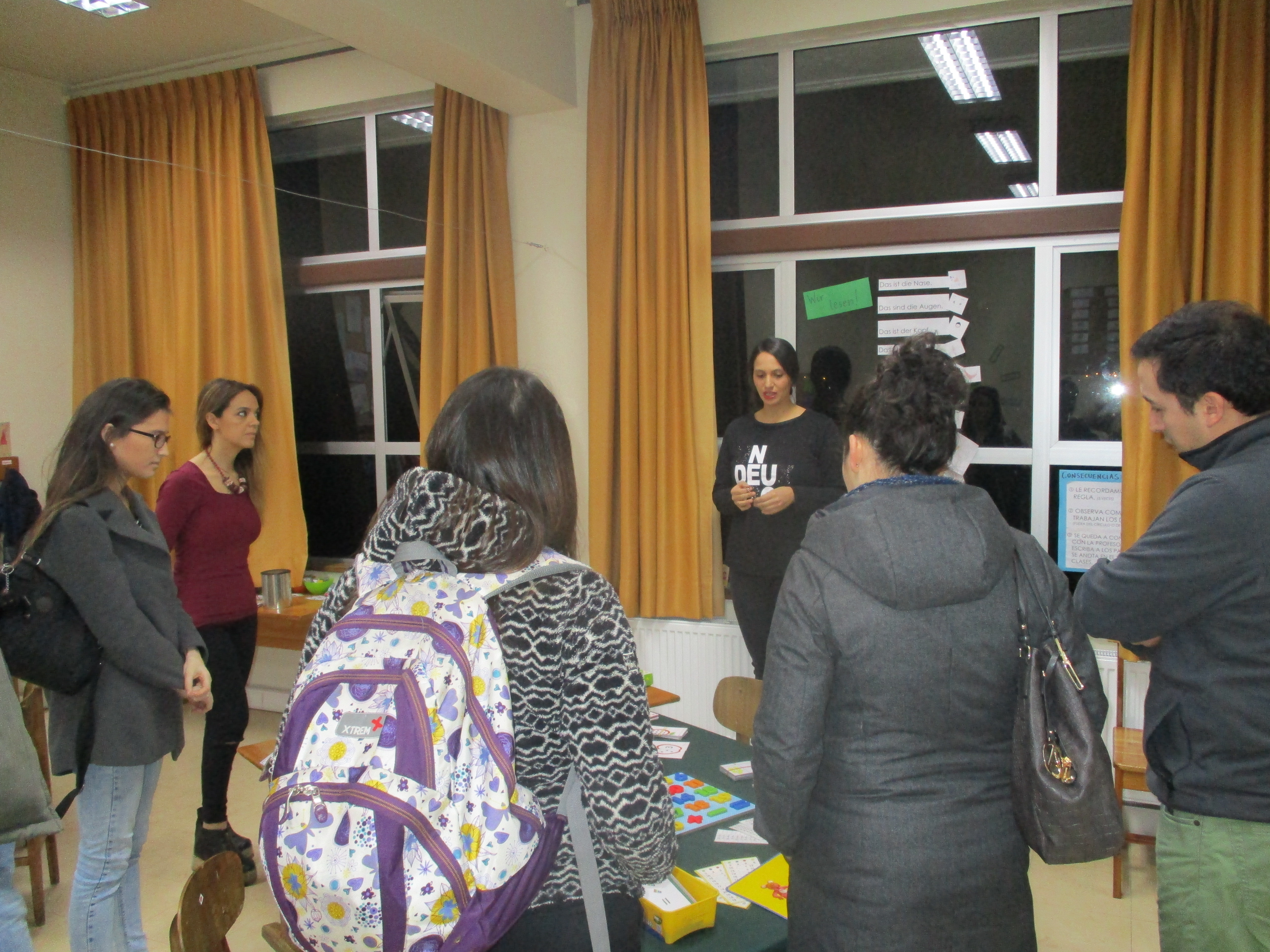 Con una breve explicación de parte del Equipo de Articulación acerca de la modalidad del trabajo a continuación, se invitó a los padres a “Caminar juntos a 1º básico”, realizando el recorrido desde el hall de Kinder hasta el forum de Educación Básica, desde donde se repartieron a las estaciones preparadas: Alemán, Lenguaje, Matemáticas y Hábitos, en los que educadoras y profesoras les explicaban las relaciones entre uno y otro nivel, las semejanzas y las diferencias. En la estación de Hábitos, por ejemplo, se trataron algunos aspectos que los niños deben afianzar y desarrollar entre Kinder y 1º básico, como la organización y la autonomía, de manera de que el cambio se realice de manera gradual y se sientan más seguros.