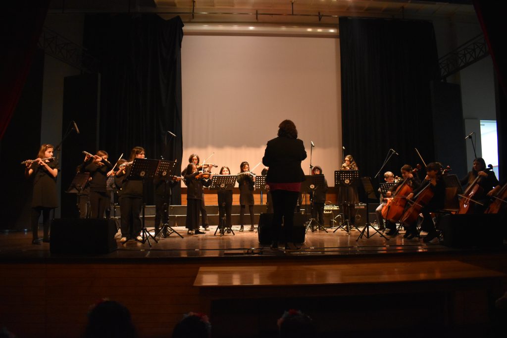 La Orquesta Intermedia, a cargo de la profesora Dayana Olmos, presentó un repertorio variado que incluyó Au claire de la lune y una canción popular francesa de Jean-Baptiste Lully, junto al Minueto en Sol mayor de J. S. Bach.