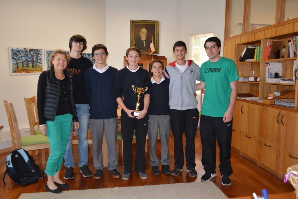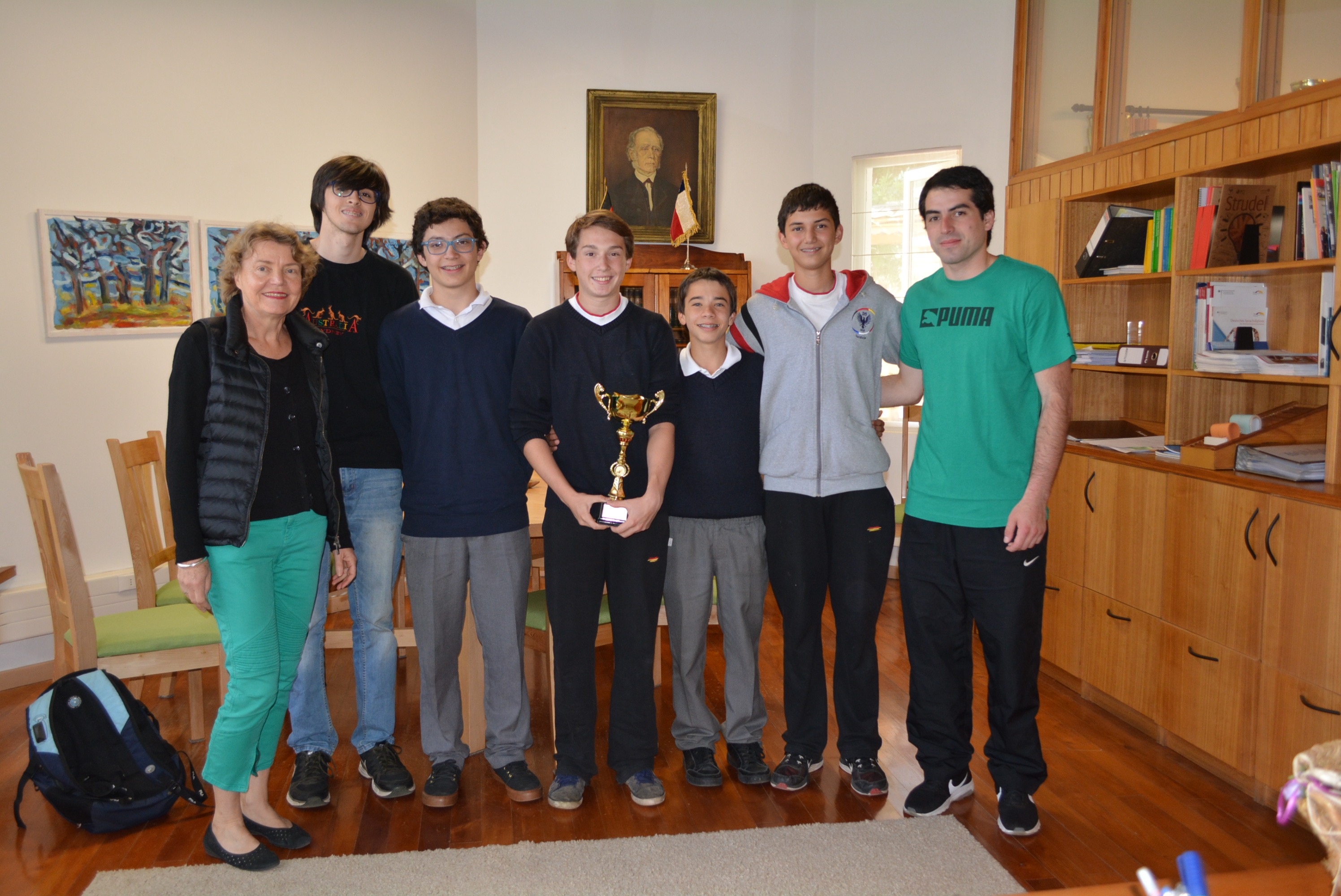 Junto a su entrenador, el profesor Germán Kutchartt, algunos alumnos del equipo cestero que ganó el Cuadrangular “Despedida de IV medios y selección” que organizó el Instituto Alemán de Osorno entregaron la copa a nuestra Rectora, Liske Salden. El equipo ganador fue conformado por: Lucas Quinn, Tomás Daetz, Enzo Meneses, Martín Niklitschek, Mathias Porflit, Santiago Vodanovic, Benjamín Córdova, Mateo Bachmann y Víctor Bórquez.
