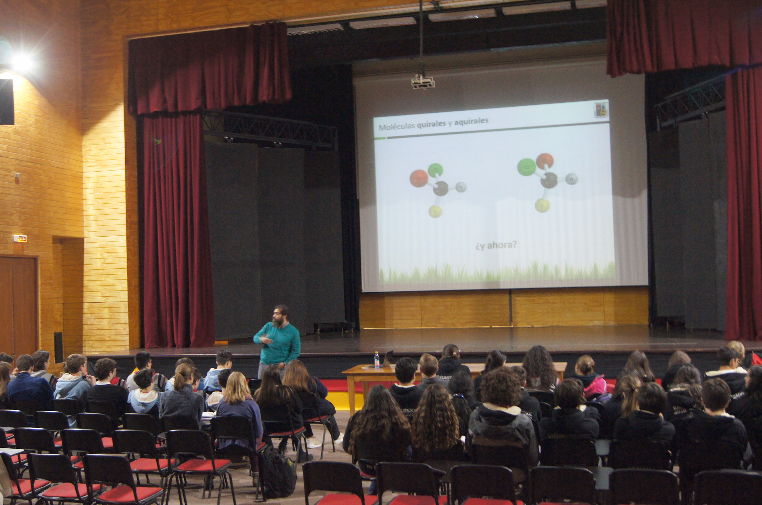 El profesional es Licenciado en Ciencias con mención en Química y Doctor en Química, de la Universidad de Chile, actualmente docente e investigador del Laboratorio de Estereoquímica y Estructura Molecular de la UACh. Su exposición fue acerca de la quiralidad en la química, característica de las moléculas de tener un par exactamente igual en posición refleja, y de cómo ésta afecta el comportamiento de las moléculas en los organismos vivos. Sin dejar de lado la complejidad del tema, la charla fue muy amena y despertó la curiosidad de los asistentes.