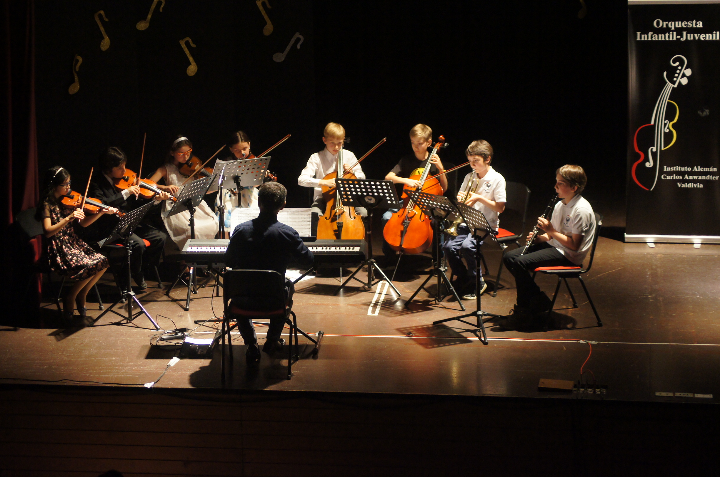La última actividad cultural del año comenzó con la presentación de la Orquesta Infantil, dirigida por el profesor Jaime Pino, con alumnos que recién parten en la ejecución grupal. Interpretaron “Tango y cha cha”, de D. R. Bellwood, y “Plucky and Bowddle”, de Norman Ward. Los integrantes del conjunto son: Amanda Valderas, Martina Vega, Catalina Jankelevic, Vicente González y Jirí Valdebenito en violín; clarinete: Bruno Tampier; trompeta: Anton Tampier; violoncellos: Leo Riegel y Lukas Dünner.