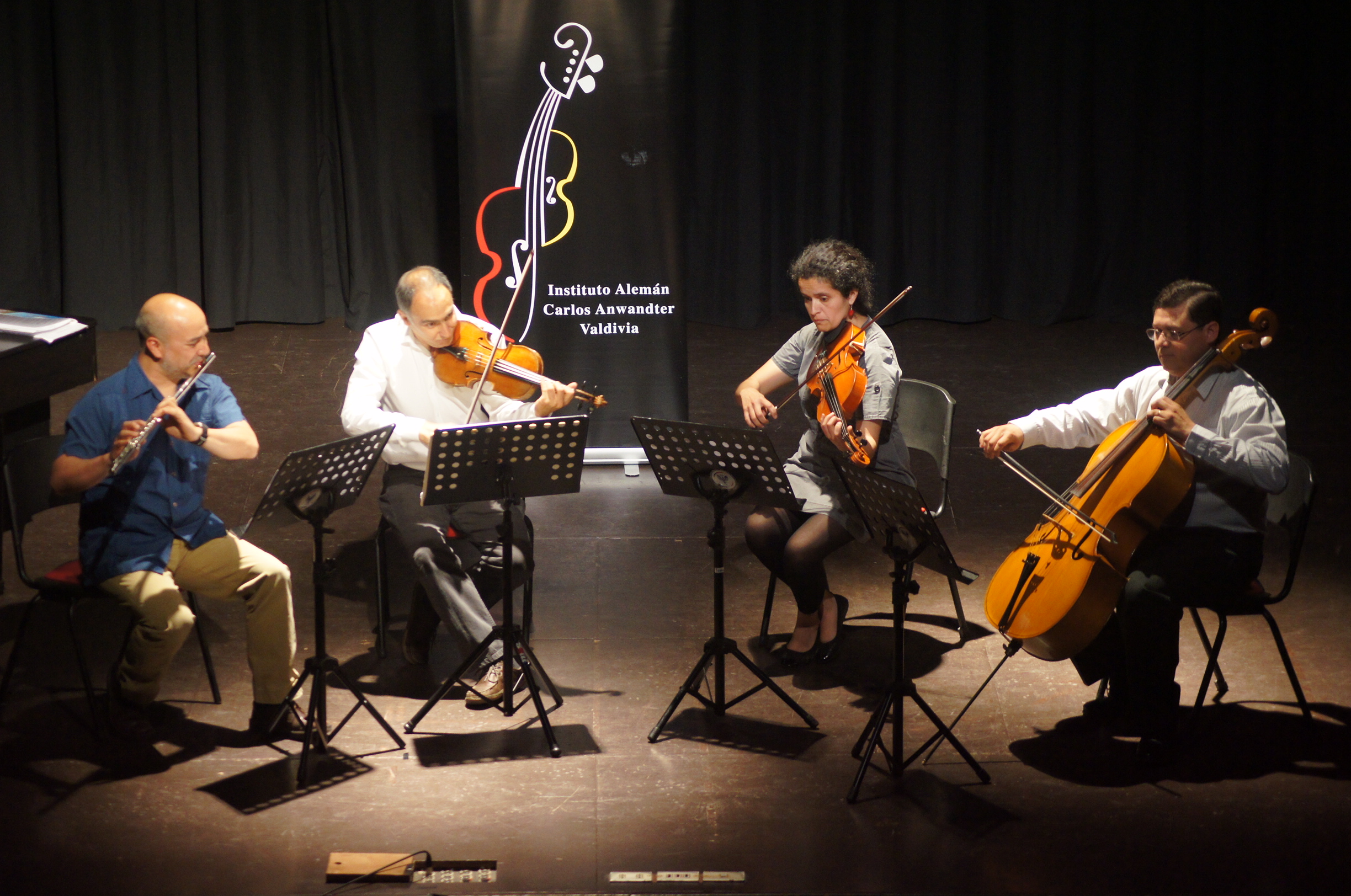 La presentación comenzó con un conjunto de cámara formado por apoderados, que interpretó el primer movimiento del Cuarteto KV 285 de Mozart con gran maestría. Agradecemos a nuestros apoderados Horacio Samaniego en flauta traversa, Juan Carlos Soto en violín, Bárbara Undurraga en viola, y Felipe Copaja en violoncello, por su colaboración musical, demostrando a los alumnos que a papás y mamás también les gusta la práctica de un instrumento musical, y que a pesar de sus múltiples responsabilidades pueden dar un espacio para ella.