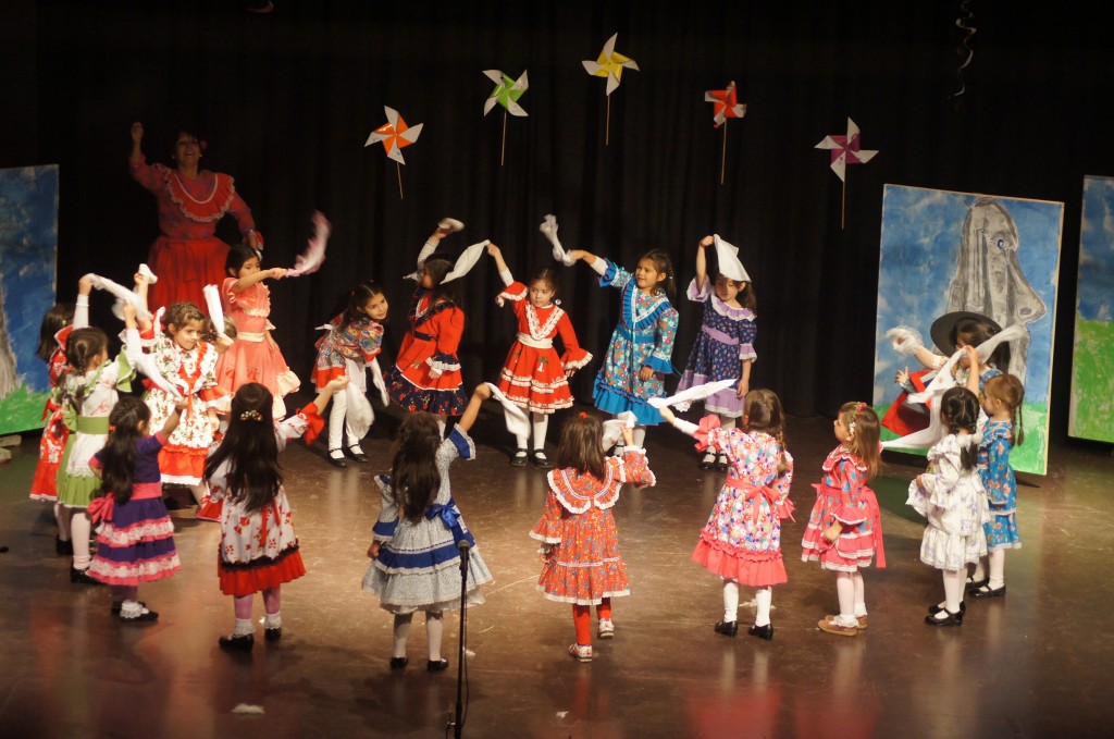 Es folgte die Darbietung der Spielgruppe Nr. 2, die, in Begleitung der Folklore-AG das Lied „La Petaquita“ sang. Im Anschluss tanzten sie das traditionelle Lied der Insel Chiloe „El gorro de lana“ (die Wollmütze), stets von ihren Erzieherinnen Nicole Gipoulou und Sigrid Brandt begleitet.