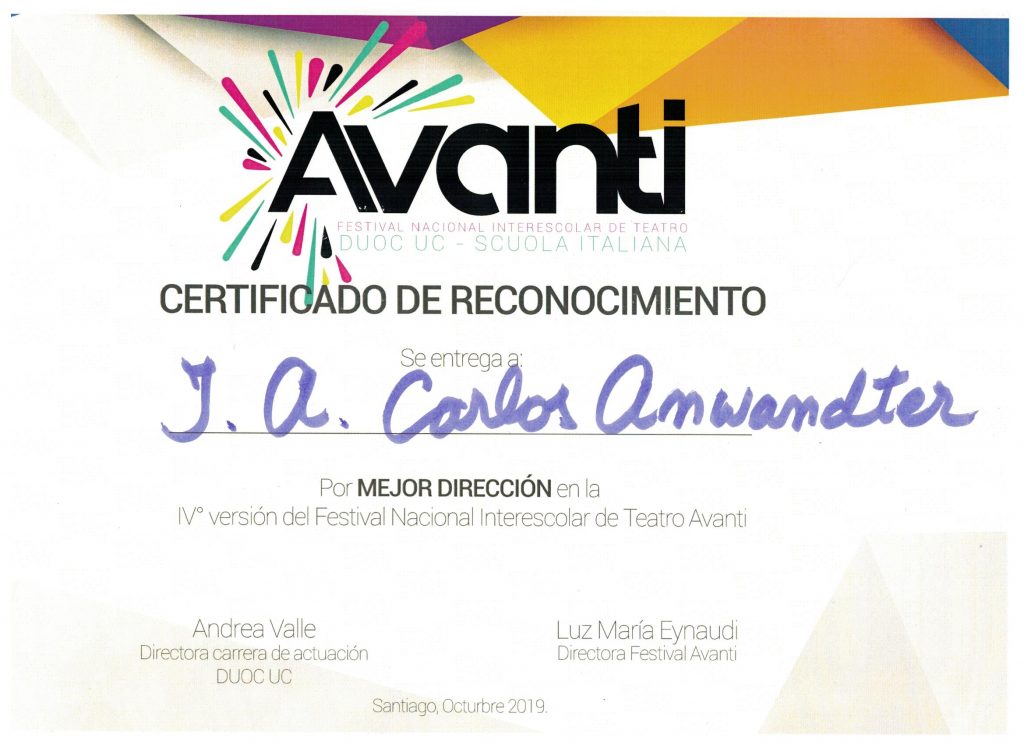 Con el montaje teatral “Historia particular del Reino de las Desigualdades”, obra que los estudiantes trabajaron desde el año pasado y que han presentado en nuestro Instituto, el Taller de Teatro de Enseñanza Media, que dirige el profesor Yerko Toliç, clasificó entre 40 colegios de todo el país para asistir al Festival Nacional Interescolar AVANTI, que se realizó en Santiago, entre el 02 y 04 de octubre, con sede en el Teatro Giuseppe Verdi del Centro Cultural Scuola, en el Auditorio II de DUOC UC Sede de San Carlos de Apoquindo, y en el Teatro Sidarte de la capital.