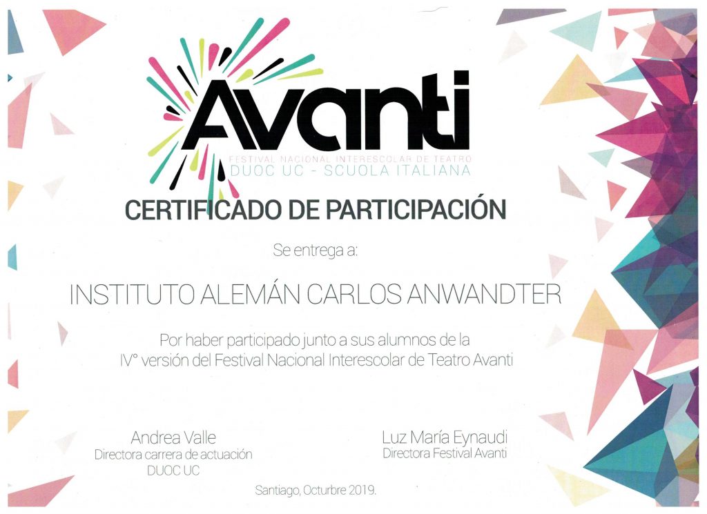 Felicitamos a nuestros alumnos, junto a su profesor, por su participación en el Festival Nacional Interescolar AVANTI y esperamos que sigan disfrutando del trabajo creativo sobre las tablas.