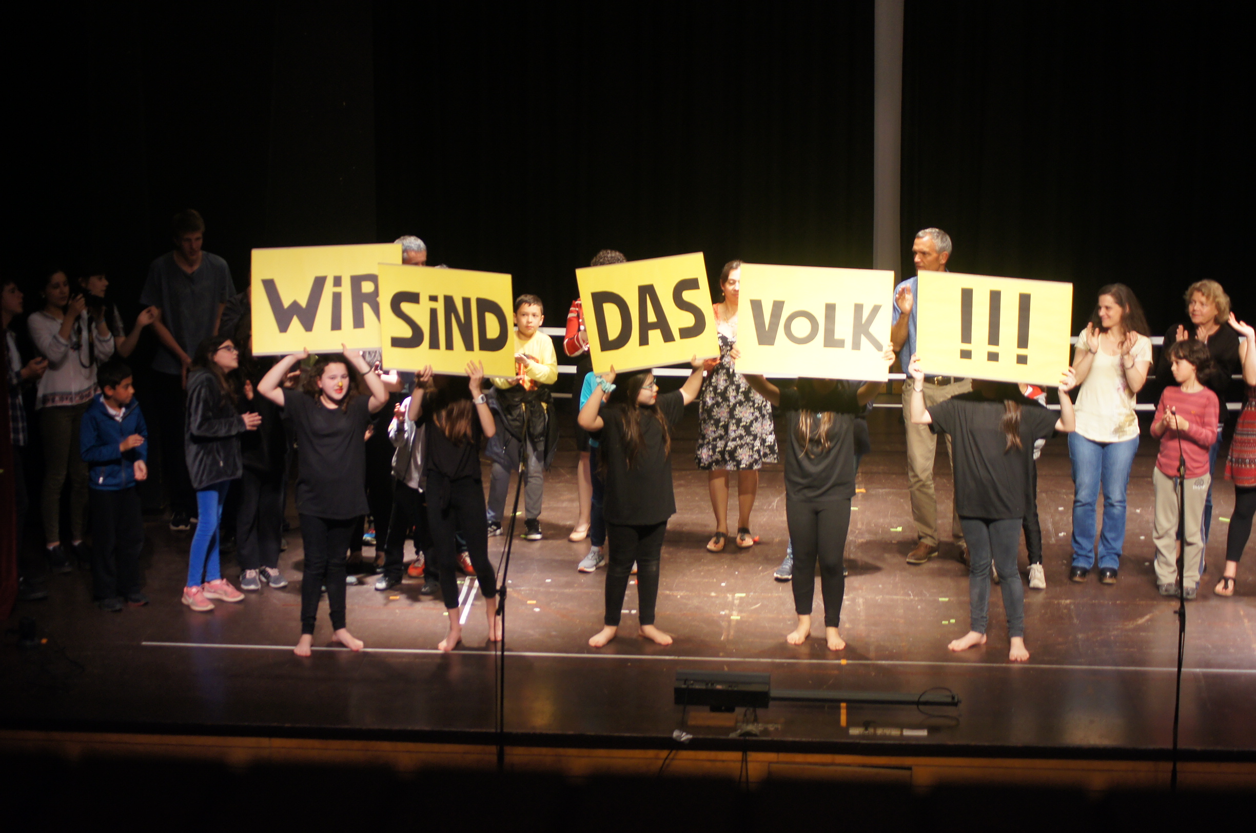 El primer montaje estuvo a cargo del Taller de Básica 1, con “Nosotros somos el pueblo”, con la propuesta de un acercamiento teatral a la historia del muro de Berlín, también llamado muro de la vergüenza. Cinco actrices representaron e interactuaron con el público desde “Radio Einfallen”, compartiendo canciones, información y consignas. El elenco estuvo conformado por: Isidora Galilea (5.1),Valentina Flandes (6.2), Alicia Bifani (7.1), Florencia Lillo (6.2) y Roberta Lagos (7.1). La obra finalizó con un alegoría de la caída del Muro de Berlín, con gran parte del público celebrando sobre el escenario.
