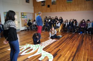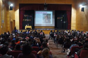 Los 7º y 8º básicos se sumaron a la charla de clausura de la jornada, “Ser feliz es gratis”, en la que Nachi Picas presentó su libro y les contó a los estudiantes su experiencia, instándolos a elegir la felicidad y elaborar su futuro con el optimismo como elección. Ella estudia actualmente segundo año de Derecho en Inglaterra; su impresionante currículum comenzó con el Premio en la 1ª versión del Concurso de Lectores Niños de la Asociación Nacional de la Prensa en 2010, continuó al año siguiente con el Premio Caso Éxito Mundial en el Uso de Tecnologías de la Información en el salón de clases, Foro Mundial de Educación de Microsoft; en 2010 fue destacada con el Premio 100 líderes jóvenes de Chile. 2012 trajo para Nachi el Premio “Diana, Princesa de Gales” (DIANA AWARD), entregado por el Reino Unido, y en 2014 obtuvo el Bright Future Award, de Scotiabank, Canadá. También en 2014 editó su libro, el que regaló al colegio y se encuentra ya en Biblioteca.