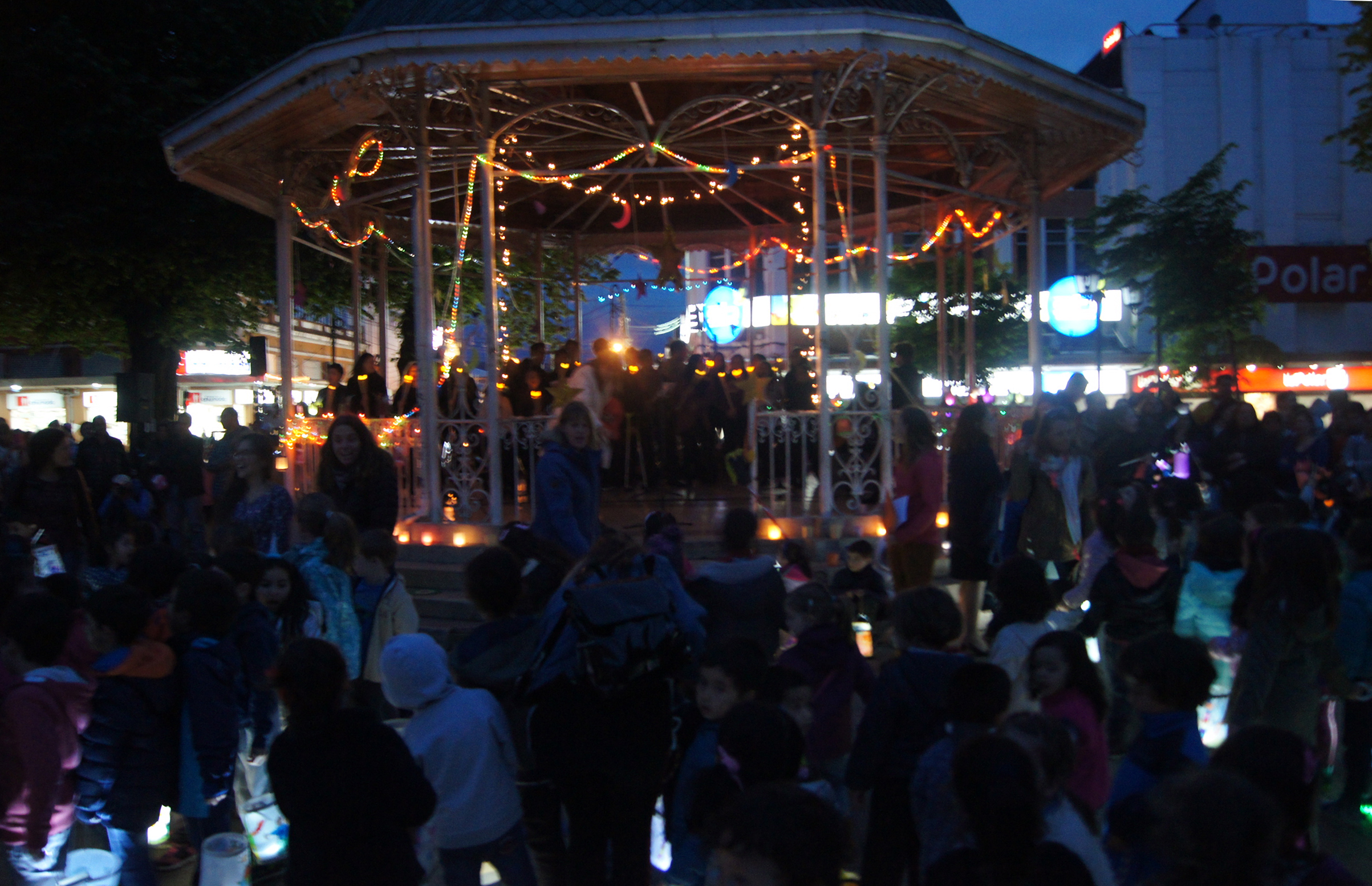 Los pequeños de Kindergarten, luego de la representación, cantaron varios de los típicos temas de esta festividad, en alemán y castellano, junto con el alegre Coro Juvenil del Instituto, que contagió de entusiasmo a los presentes, dirigido por la profesora Renate Hagedorn, y acompañado por la profesora Rosita Sandoval en guitarra. Luego de una ronda de canciones, los niños fueron a dar una vuelta por la plaza con las educadoras y luego fueron acompañados por sus apoderados en la segunda vuelta, para llegar a reunirse nuevamente frente a la pérgola y cerrar la actividad levantando todos sus faroles.