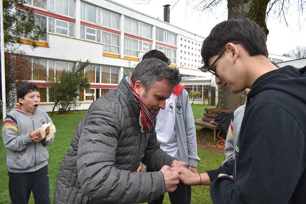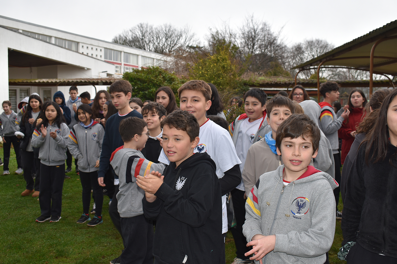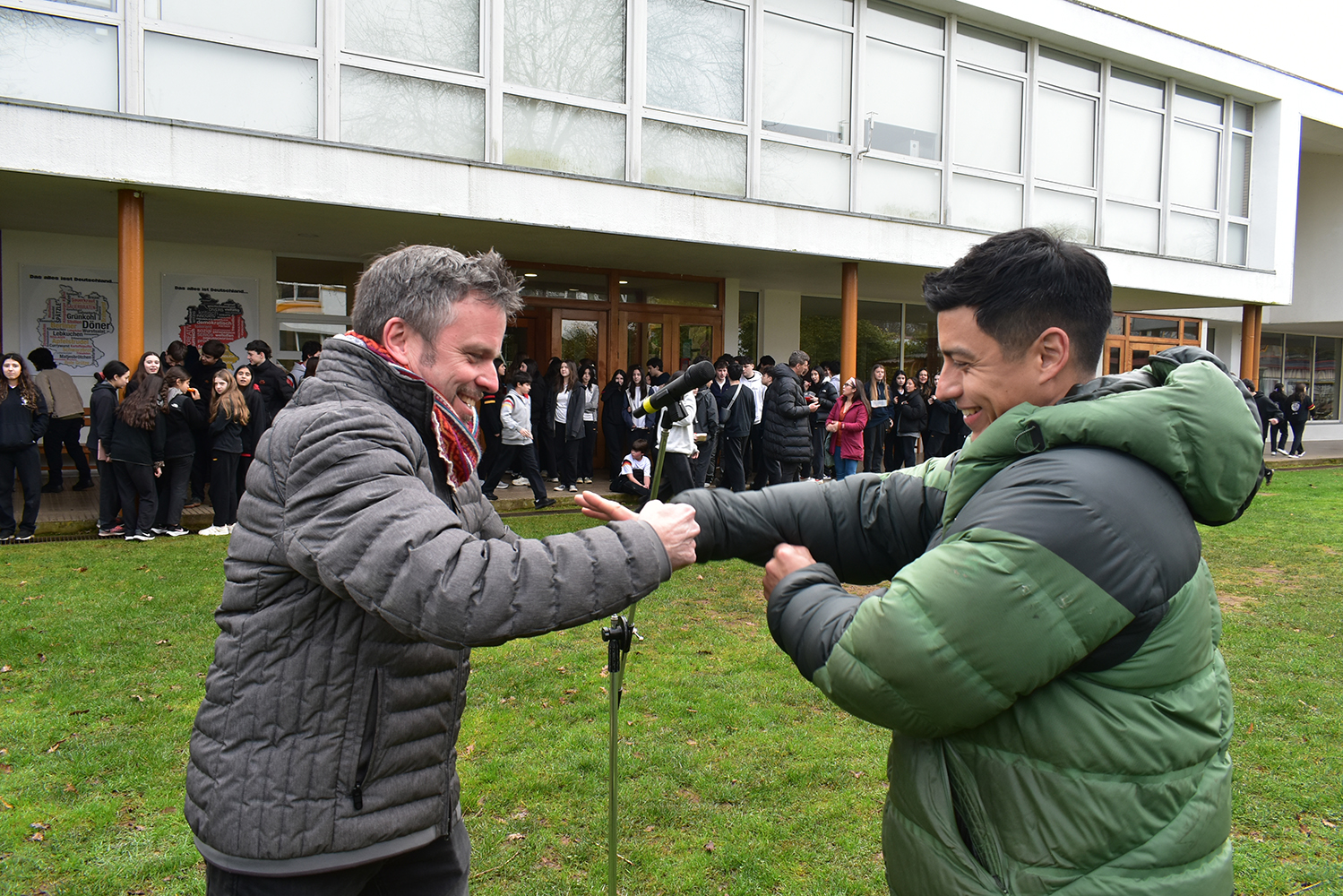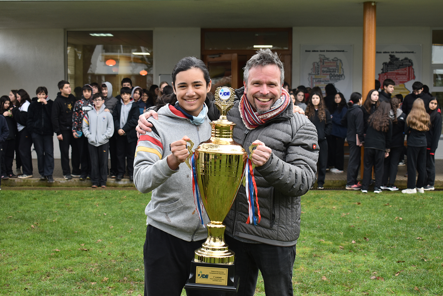 Heute Morgen wurde die Mannschaft unter der Anwesenheit unseres Schulleiters Markus Biber und der Sportfachleiterin Bárbara Lillo von unserer Schülerschaft mit begeistertem Applaus im Schulhof empfangen.