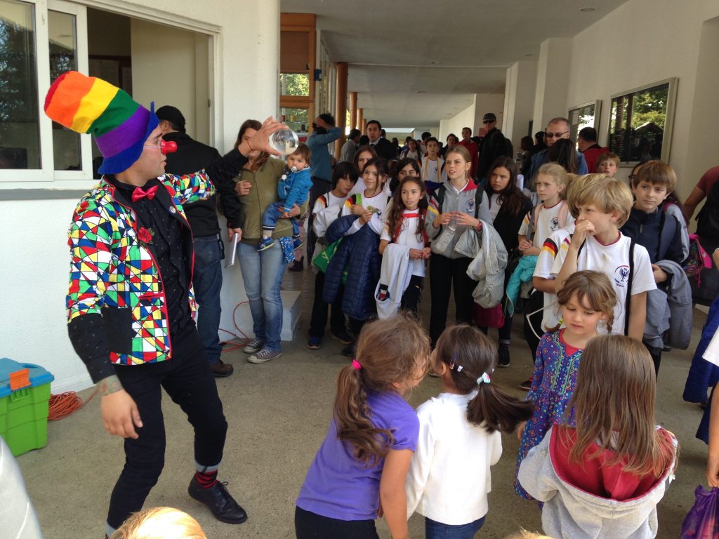Los niños se reunieron en torno al malabarista, mientras por altoparlantes sonaba la invitación a asistir entre las 11:00 y las 19:00 hrs. al colegio, que ese día se transformará con una gran carpa de eventos, un patio de comidas y entretenidos juegos para todas las edades.