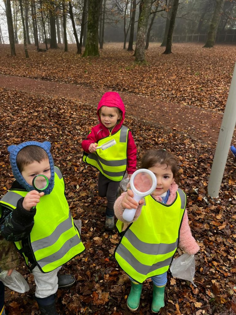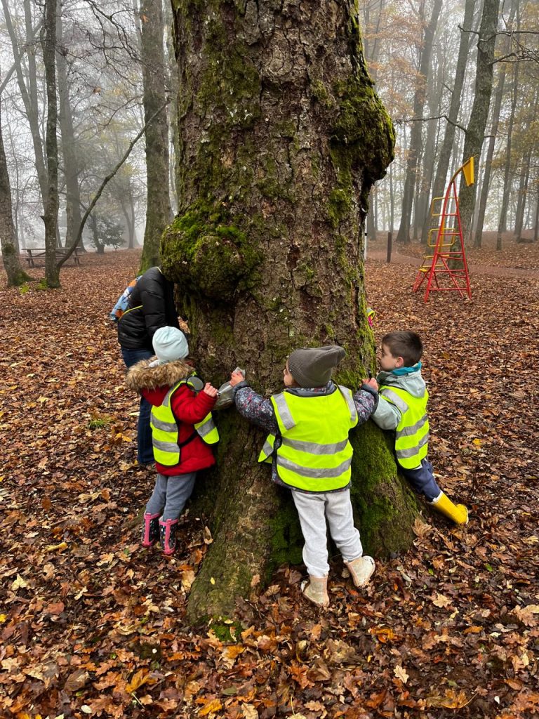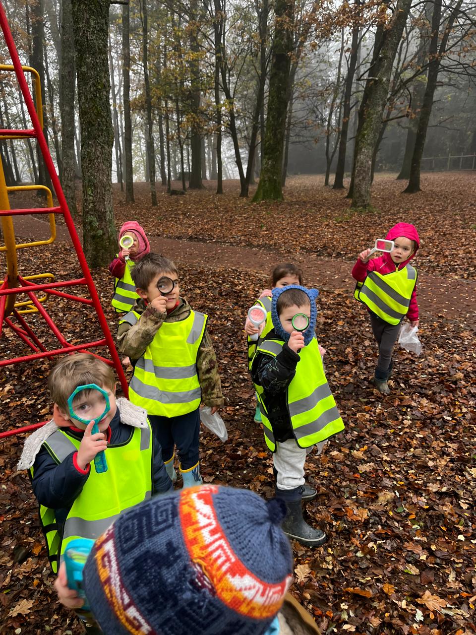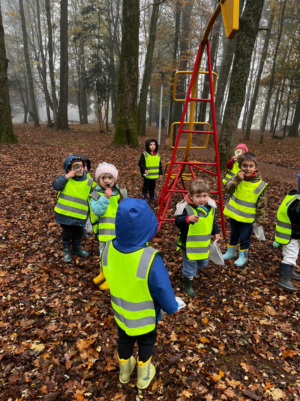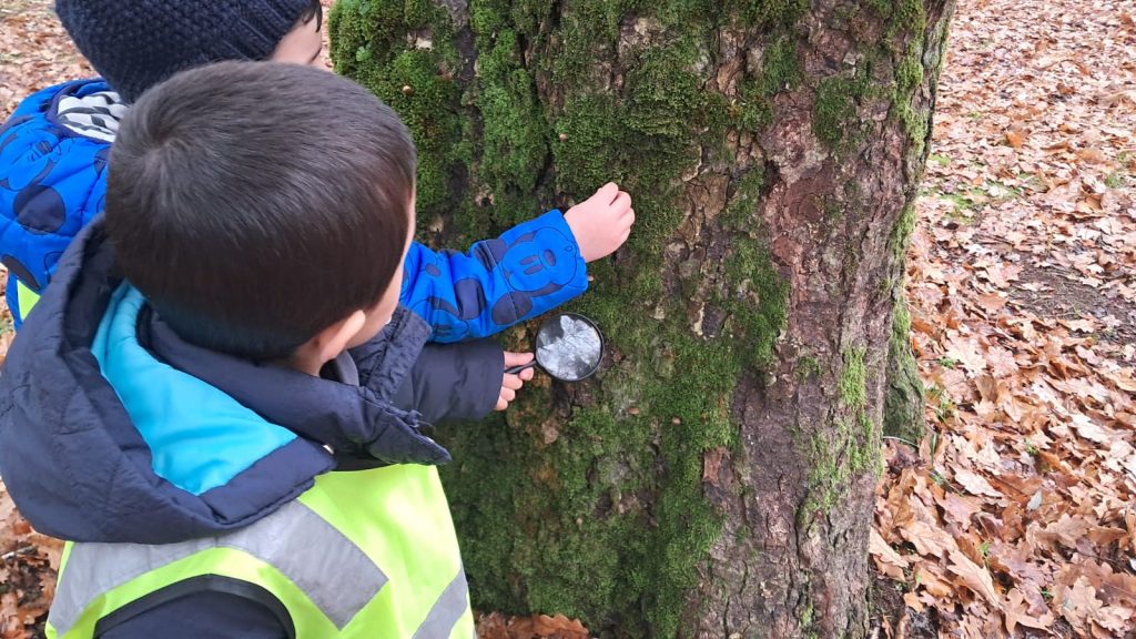 Ya en el parque, se entregó una lupa a cada niño, herramienta que les permitió observar con detalle la vegetación, la cáscara de los árboles y pequeños insectos, fomentando la curiosidad y el contacto directo con la naturaleza. Las educadoras delimitaron el espacio dentro del cual los niños podían desplazarse libremente, promoviendo un entorno seguro y de confianza para la exploración.