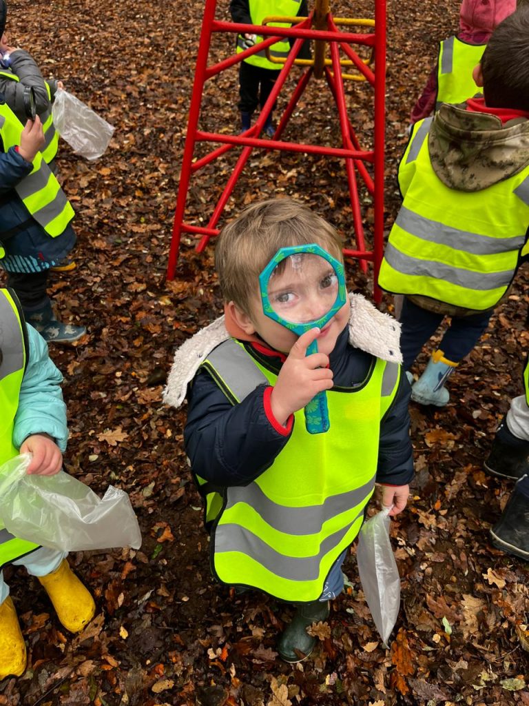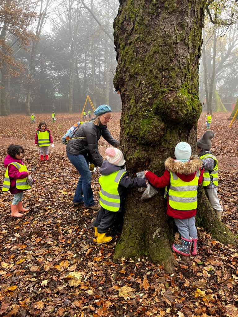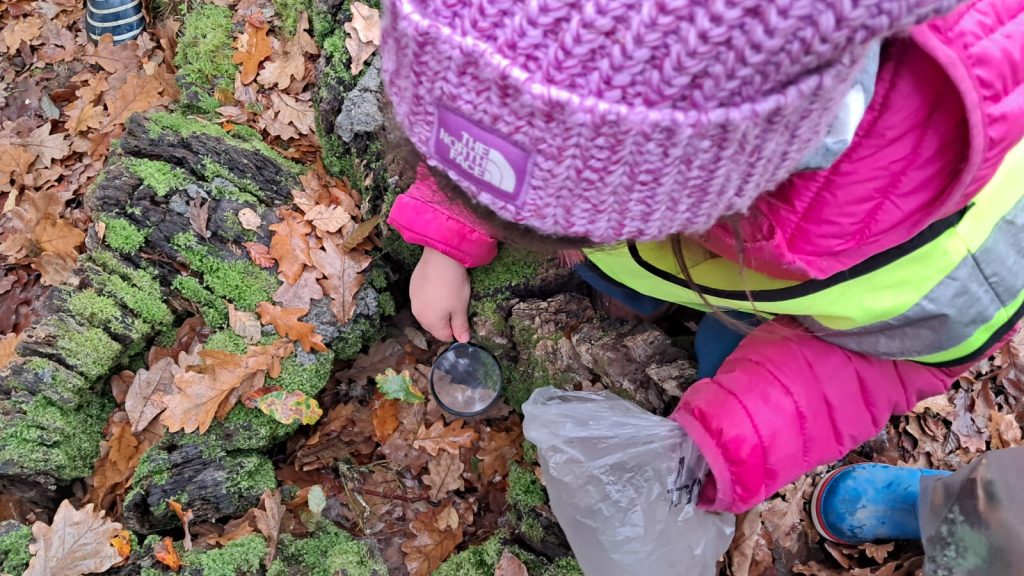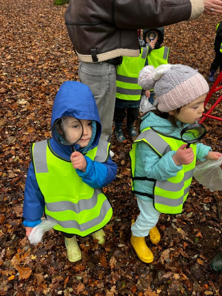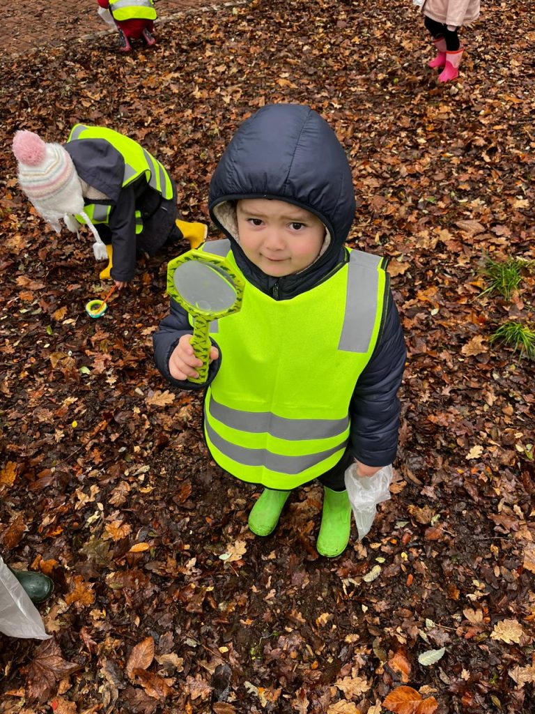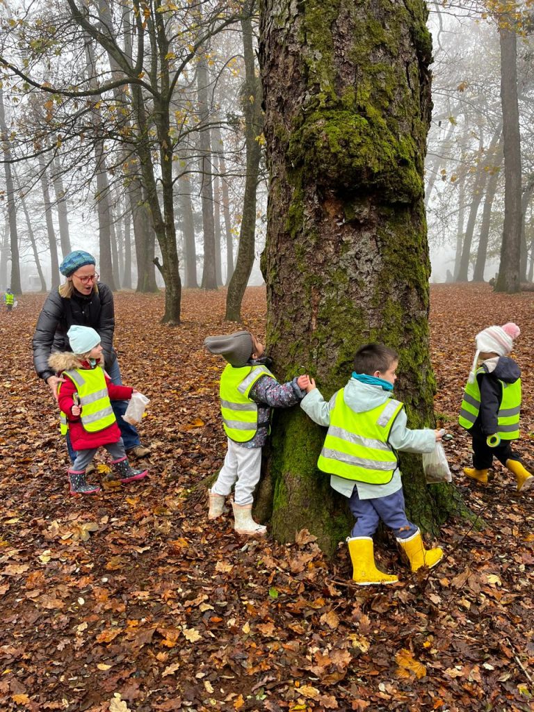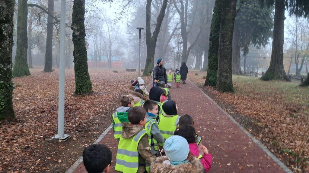 Ya en el parque, se entregó una lupa a cada niño, herramienta que les permitió observar con detalle la vegetación, la cáscara de los árboles y pequeños insectos, fomentando la curiosidad y el contacto directo con la naturaleza. Las educadoras delimitaron el espacio dentro del cual los niños podían desplazarse libremente, promoviendo un entorno seguro y de confianza para la exploración.