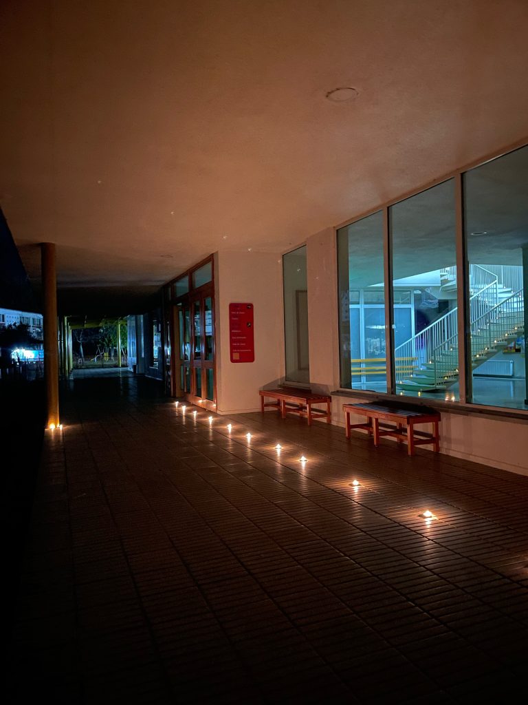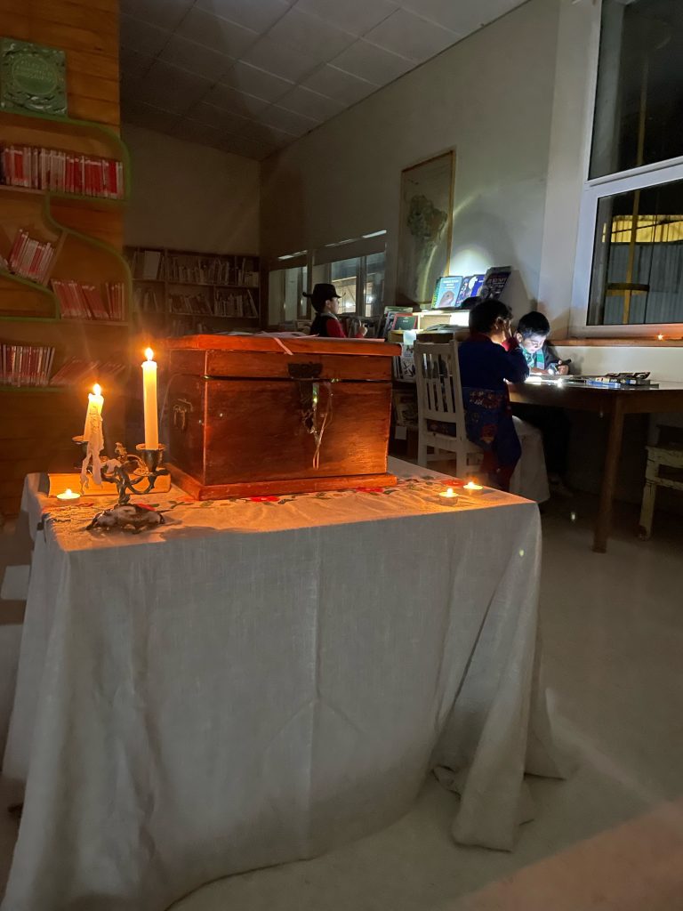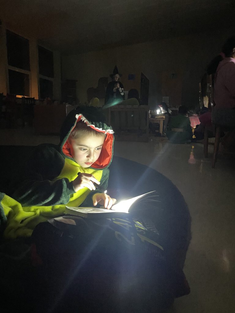 Los pasillos y la escalera de entrada estaban iluminados con velas, y la biblioteca tenía un ambiente misterioso y acogedor. Cada niño venía preparado con su cojín, su linterna y mucha emoción.