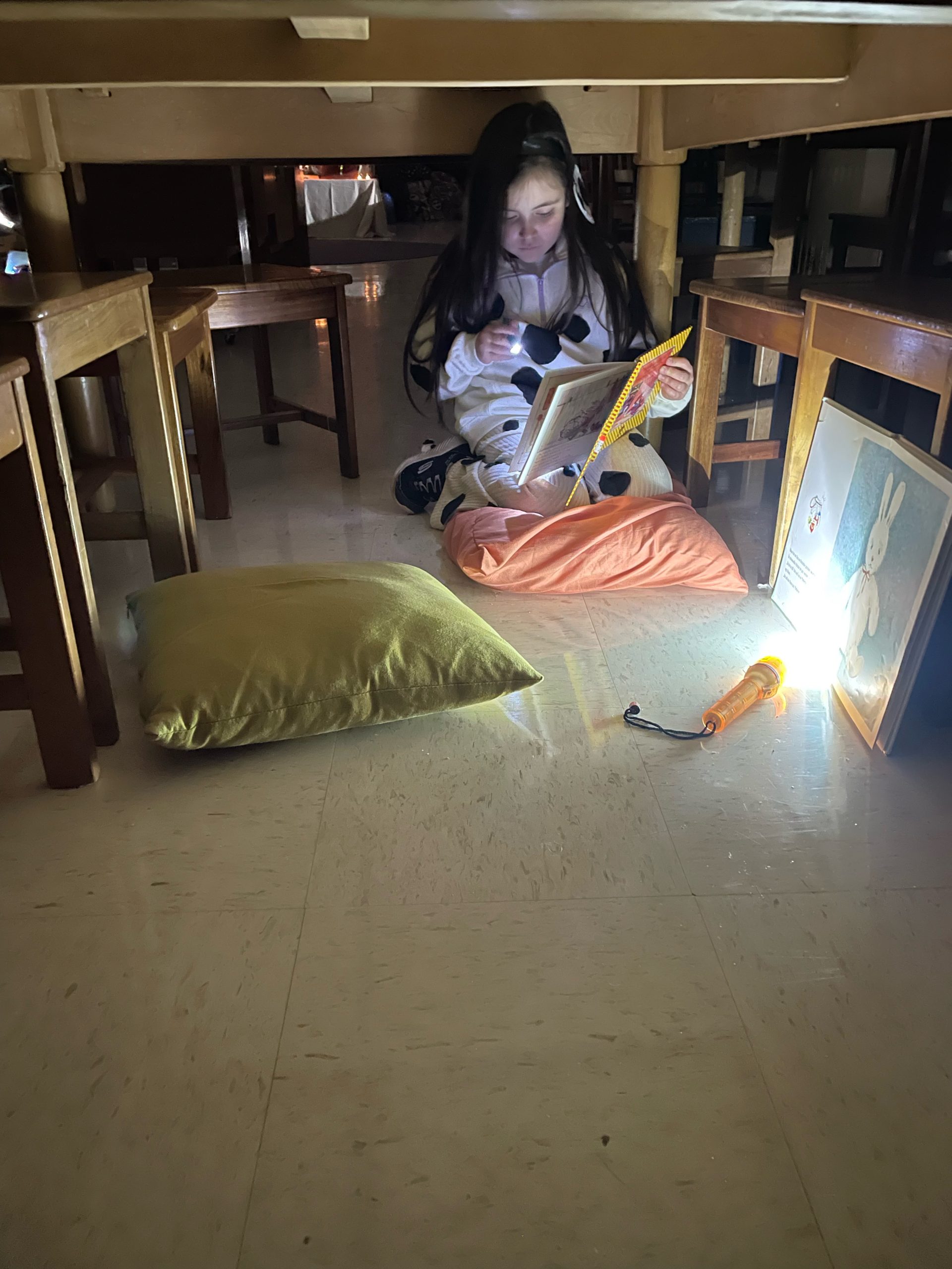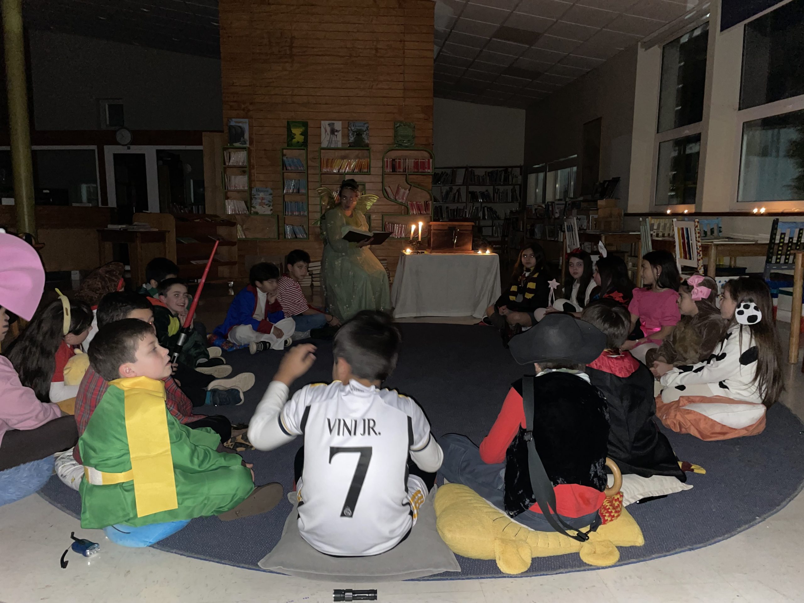 Los pasillos y la escalera de entrada estaban iluminados con velas, y la biblioteca tenía un ambiente misterioso y acogedor. Cada niño venía preparado con su cojín, su linterna y mucha emoción.