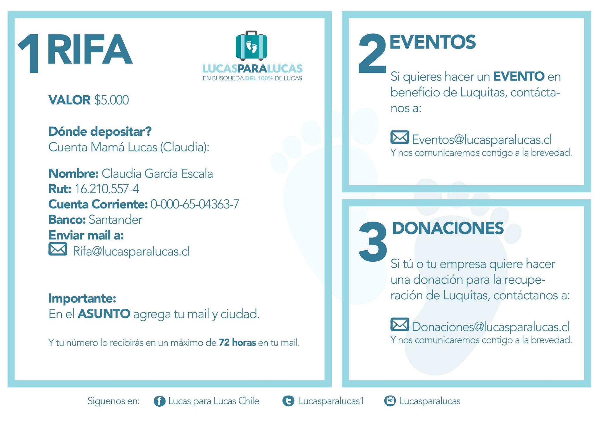 Der Elternbeirat und die Schülervertretung haben bereits Spendenaktionen organisiert, um Gelder zu sammeln. Des Weiteren bietet die Kampagne mehrere Möglichkeiten, direkt zu helfen, die Sie auf ihrer Facebookseite sehen können: https://www.facebook.com/lucasparalucaschile. Hier finden sie ebenfalls viele Grußworte von chilenischen und internationalen Prominenten, wie zum Beispiel Ricky Martin, der seine Grüße aus Australien übermittelte. Man kann bereits Lose für eine Tombola kaufen, die am 6. November stattfinden wird und bei der zahlreiche aus Spenden bestehende Preise gewonnen werden können. Die Geschichte von Luquitas, wie er liebevoll von seinen Eltern in ihren Veröffentlichungen genannt wird, können Sie auf folgender Webseite lesen: http://www.lucasparalucas.cl.