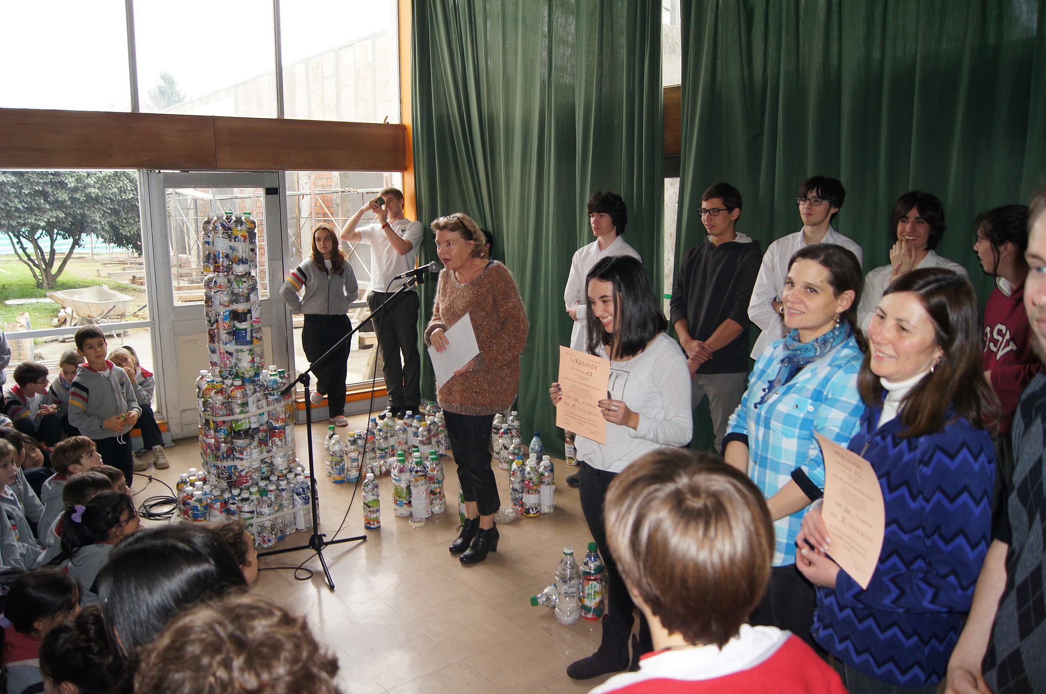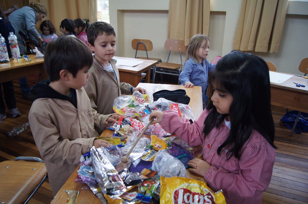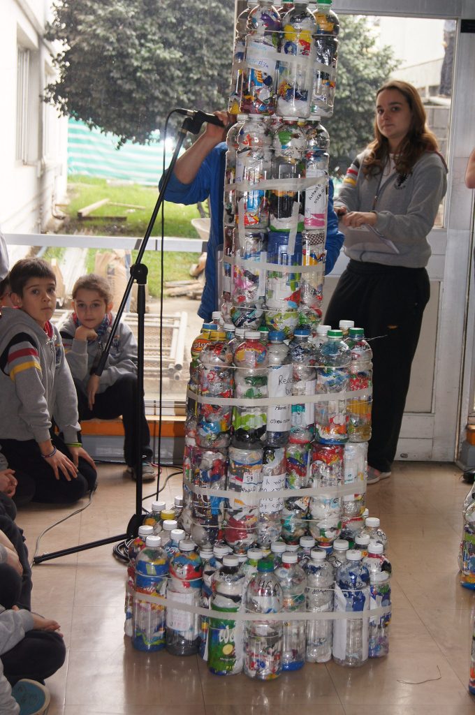 Perfekt geschult stellten die Schüler anschließend zwischen 10:20 Uhr und 11:50 Uhr Öko-Bausteine her. Diese sollten mit Flasche und den hineingestopften Plastikmaterialien möglichst 500 Gramm wiegen. Einige Klassen bekamen Besuch von neugierigen Kindergartenkindern, die mithalfen.