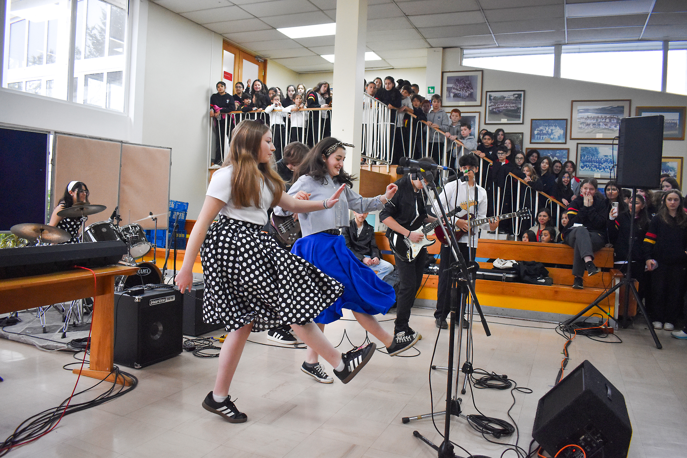 Am Donnerstag, den 22. Mai (beide Pausen), und Freitag, den 23. Mai (erste Pause), präsentierten SchülerInnen unter der Leitung von Renate Hagedorn ein Rock-and-Roll-Special. Mit Interpretationen bekannter Klassiker, lebendigen Darstellungen ikonischer SolistInnen und Bands sowie authentischen Choreographien und Kostümen brachten sie Schwung und Farbe in den Pausenhof.
